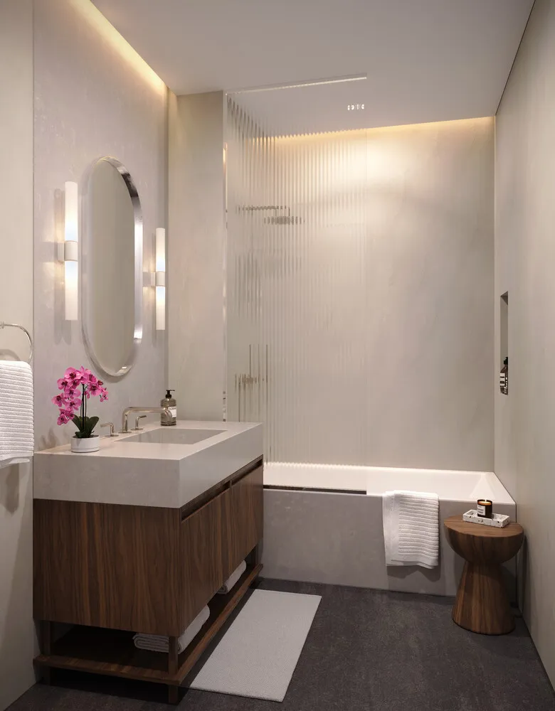 The secondary bedroom is provided with ample closet space, while the secondary bathroom features Cosentino Dekton wall cladding and flooring, a walnut vanity topped with Poblenau quartz, and a fluted glass shower enclosure.