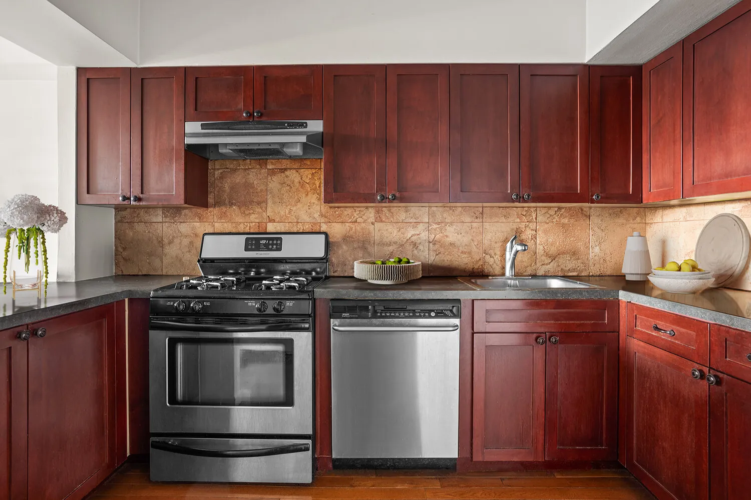 The apartment features a generous open layout with a spacious living and dining area that flows seamlessly to a private balcony. The open kitchen is thoughtfully designed with rich wood cabinetry, stainless steel appliances, and a breakfast bar that comfortably seats two, creating a functional and inviting space for daily use. The primary bedroom offers generous proportions and comfortably accommodates additional furniture or a workspace.