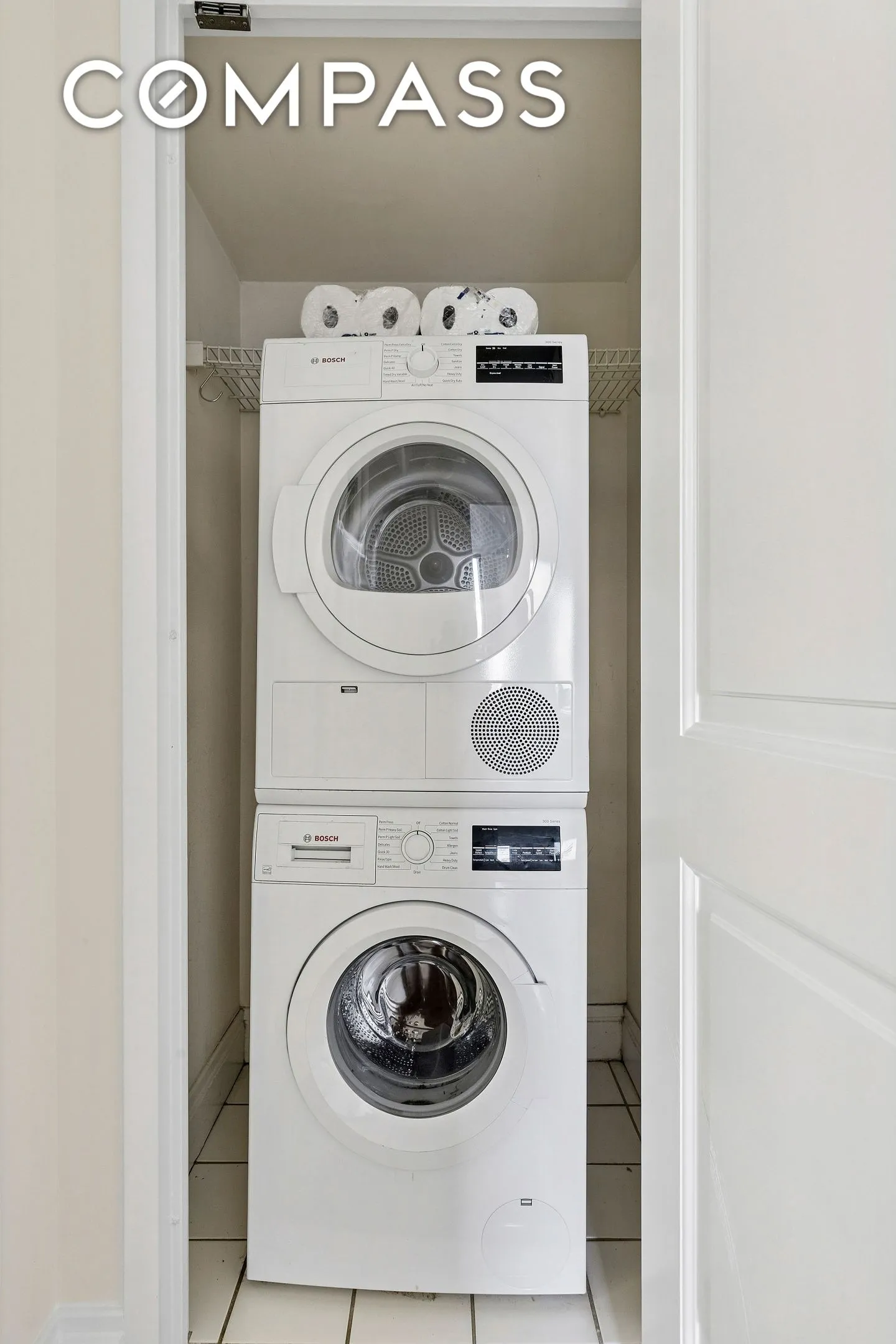 The tiled bathroom boasts a bathtub and vanity with ample storage. An in-unit washer/dryer completes the convenience of this well-appointed residence.