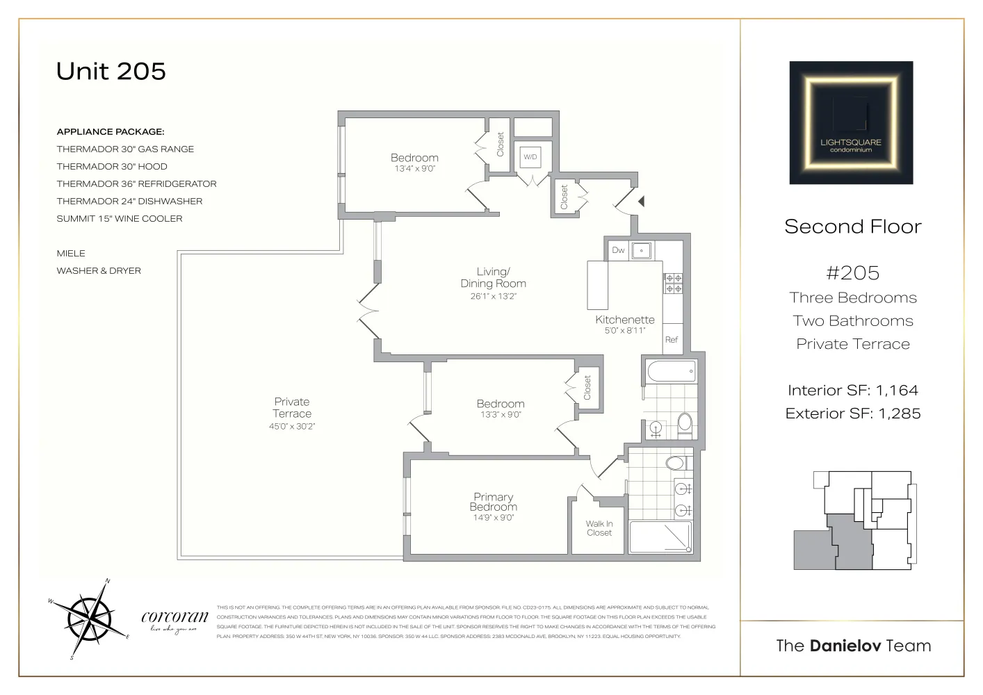 Unit 205 introduces a spacious 3-bedroom, 2-bathroom layout complemented by a massive 1284 sqft terrace. The kitchen, featuring a large island, overlooks the expansive living and dining area, creating a seamless transition that opens onto the terrace, harmoniously blending indoor and outdoor living. The guest bathroom offers luxury finishes, including a deep soaker tub, illuminated medicine cabinet, custom vanity, double towel bar, and porcelain tiles from Italy & Brazil, with radiant heat floors for added comfort. The secondary bedroom conveniently opens onto the terrace, while the primary bedroom boasts a walk-in closet and an en suite bathroom equipped with a custom-made double sink cabinet, illuminated double medicine cabinet, dual vessel sinks, wall-mounted faucets, Spanish porcelain tiles, a curbless shower with glass partition, and radiant heat floors, ensuring a perfect blend of elegance and functionality.