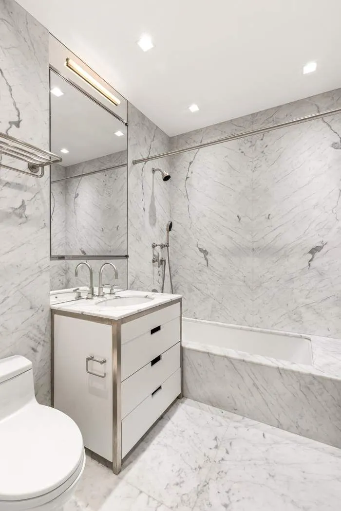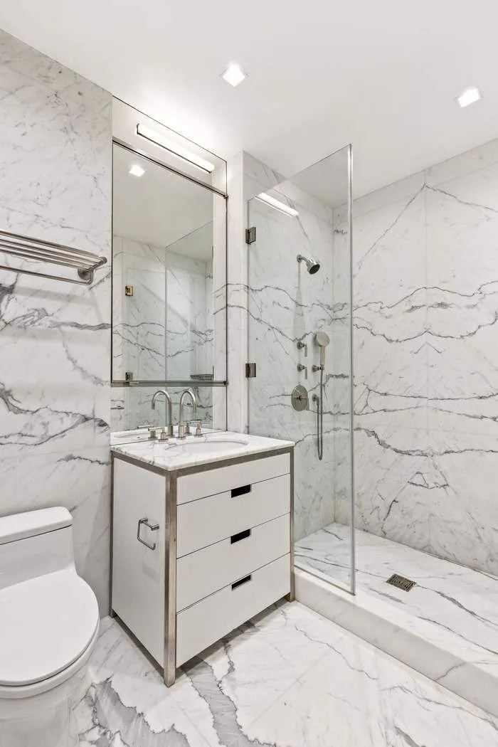 Stautorio Marble clad bathrooms offer radiant heat flooring, Duravit fixtures, and custom vanities.