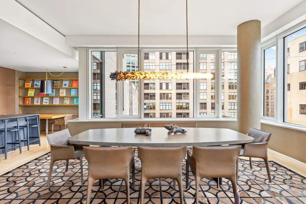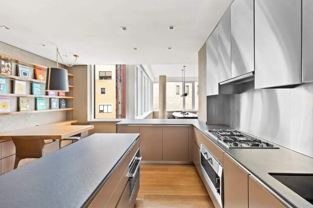 The apartment’s chef’s kitchen by Boffi features stainless steel cabinetry, Dekton countertops, a 36” Sub-Zero refrigerator, additional 30” Sub-Zero wine cooler and beverage refrigerator, Gaggenau oven, cooktop, and dishwasher, and a Miele speed oven/microwave.