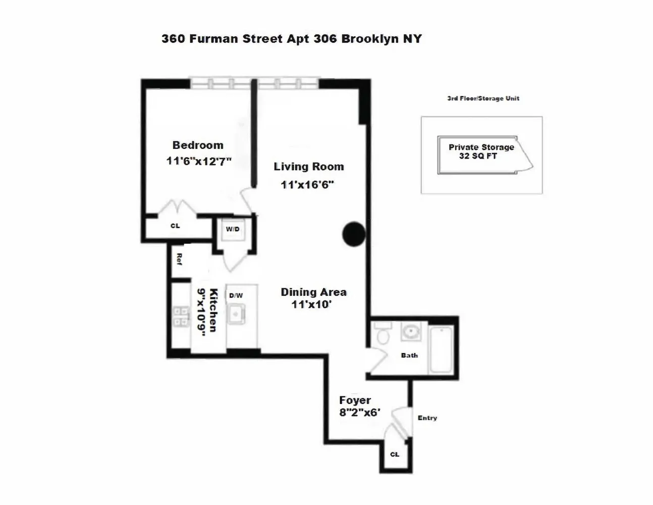 was originally built in 1928 and converted to condominiums in 2008. #306 has a lovely entryway leading to the kitchen and open living room. The upscale kitchen has a large granite marble top which easily fits bar stools. The exquisite custom cabinetry is by Dada and a SubZero refrigerator, gas cooktop which is vented out. There is a washer/dryer closet in the apartment. The large bedroom also has large windows letting light into the space. Presently there is a queen size bed. Gorgeous solid oak floors, Your have your own storage cage approximately 29 s/f & 12 foot high ceilings on the same floor. OBB is surrounded by OBBP an 85 acre park which stretches 1.3 miles along the water. The park provides playing fields, sport courts, playgrounds, kayaking and canoeing. One Brooklyn Bridge features a 3,000 s/f gym, a Yoga studio, cardio room, 9-seat Screening room, A music room with a Baby Grand Piano, and a set of drums, two play rooms, a billiards room, numerous meeting rooms, a golf simulator room & an outdoor putting green. One Brooklyn has a great staff of doormen, porters, & a concierge ready to assist you. There is a resident manager. NY Waterway Ferry to Wall Street and numerous other destinations. Parking available to purchase or rent.