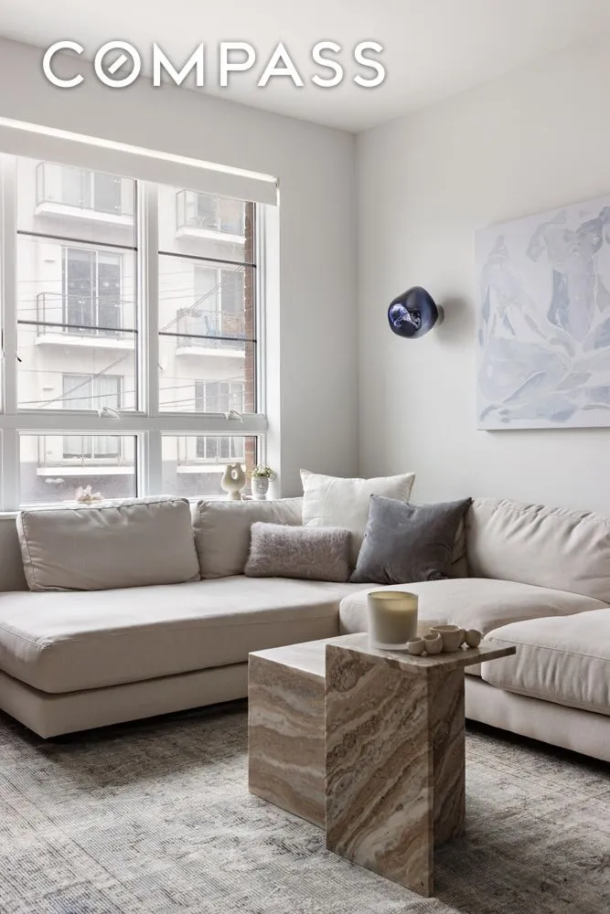 Residents enjoy access to a fully equipped gym, common bike storage, and a roof deck with skyline views.