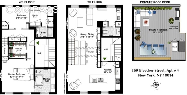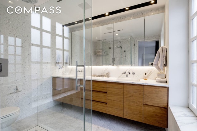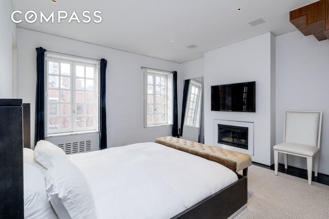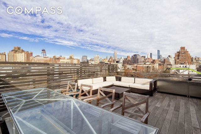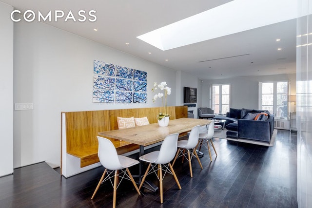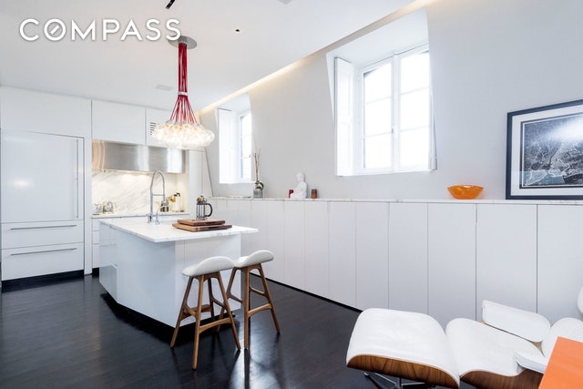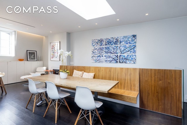 Enter the 1,600-square-foot residence on the upper level and take in sleek, contemporary living spaces bathed in natural light thanks to an oversized skylight above and windows facing east and west. High ceilings and dark stained white oak floors usher you into the modern white-on-white kitchen where slabs of statuary marble top rows of cabinetry and appliances by Sub-Zero, Bosch and Gaggenau abound. A gas fireplace here provides the perfect sitting area for morning coffee, while the built-in walnut banquet sets a perfect stage for lively dinner parties nearby. With a perfect layout for entertaining, the spacious living room is outfitted with another warm fireplace, a wet bar with Sub-Zero wine refrigerator and a convenient powder room. Head to the serene lower level to find the home's utterly private bedroom suites. In the sprawling master, west-facing windows capture treetop views while yet another gas fireplace and a truly enviable walk-in closet spark envy. The en suite bathroom in Carrara marble and features an oversized dual-sink vanity and huge glass-enclosed shower. The home's second bedroom suite has been outfitted with a relaxing infrared sauna, a Murphy bed, a steam washer-dryer and an equally well-appointed en suite bathroom.The dream of indoor-outdoor living is a reality in this perfectly executed home thanks to the spacious and well-equipped private deck up top. The rooftop includes an automated irrigation system, lighting, a built-in glass table that straddles the skylight below, a top-of-the-line barbecue grill, bar refrigerator and outdoor flat-screen TV ? all surrounded by wide open views that skim over historic brownstones and iconic skyline views, all the way to the Empire State Building and beyond. Two-zone central air conditioning, ADT alarm system, custom recessed lighting, tons of storage and built-ins, and a complete Sonos sound system that runs indoors and out make this impeccable duplex the perfect downtown abode in the heart of the West V