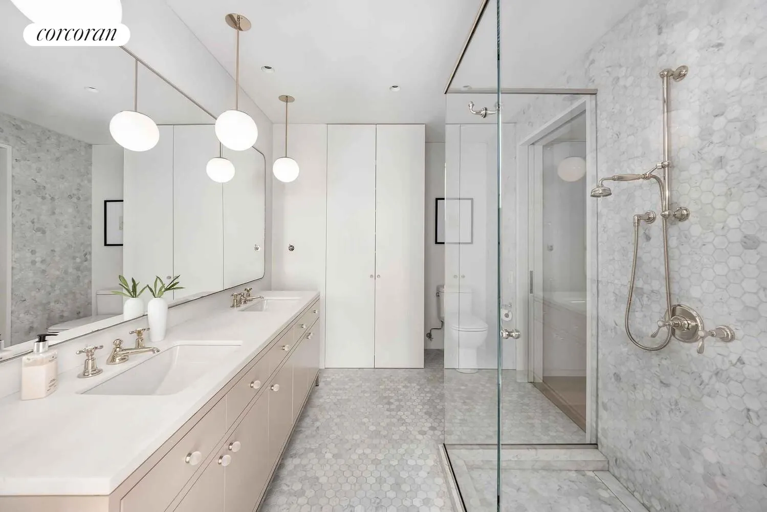 Upstairs, four bedrooms are thoughtfully positioned for privacy. The primary suite is a private retreat with a sitting room, dual dressing rooms, and two spa-like, windowed en-suite bathrooms. Radiant heated floors, a freestanding soaking tub, walk-in steam showers, and bespoke vanities complete the space. Each additional bedroom includes generous closets and beautifully finished en-suite baths. One of the primary suite's dressing rooms-currently configured as the "his" closet-can easily be converted into a fifth bedroom with its own private en-suite bath, offering exceptional flexibility.