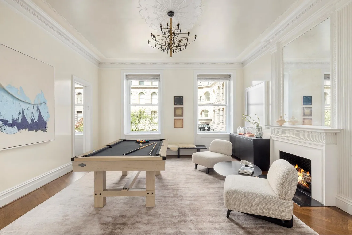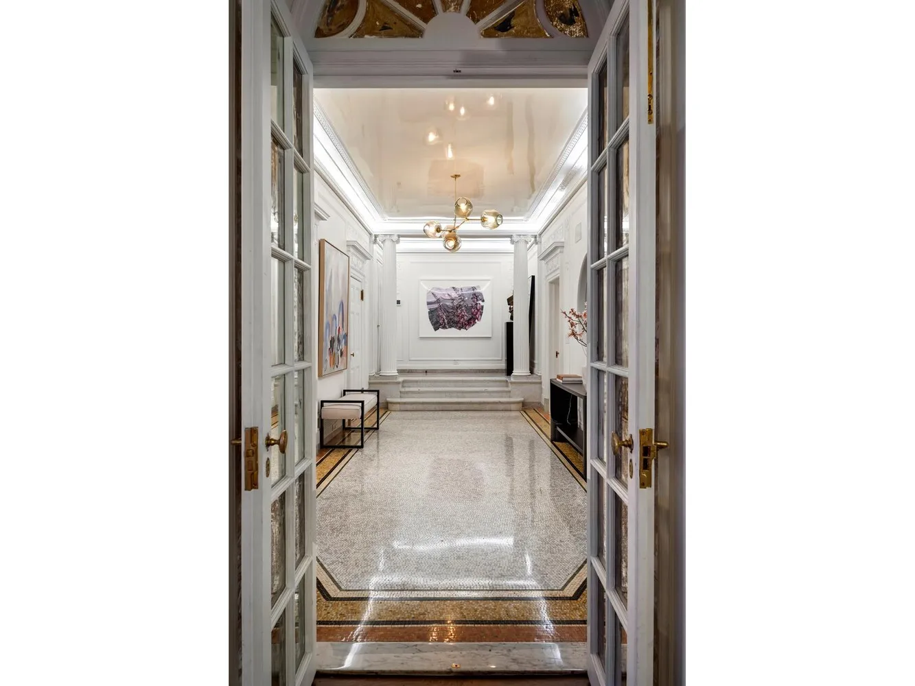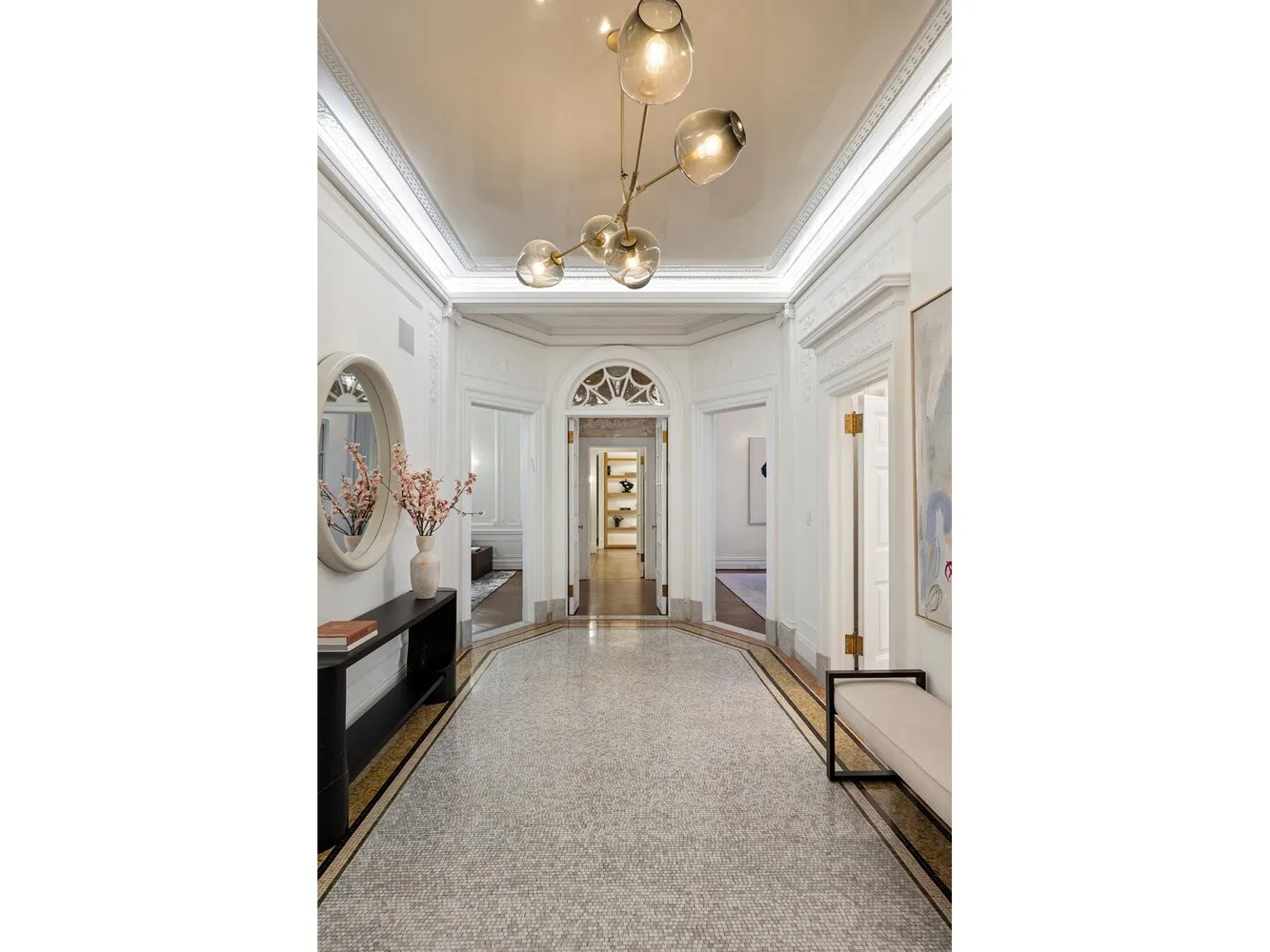 This 9-bedroom, 9-bathroom apartment epitomizes timeless sophistication. Renowned for its pre-war elegance, guests are welcomed by an expansive entry foyer adorned with The Apthorp's original iconic architectural details. Soaring ceilings reaching over 10.5 feet in height create an atmosphere of grandeur. Marble mosaic flooring, stately columns and crown molding demonstrate the expert craftsmanship The Apthorp is famed for. Oak herringbone floors lead you through generously proportioned rooms, featuring elegant fireplaces and majestic original decorative moldings. Oversized windows illuminate the entire space with natural light and offer serene eye-level views onto the flowering trees and fountains of the interior courtyard.