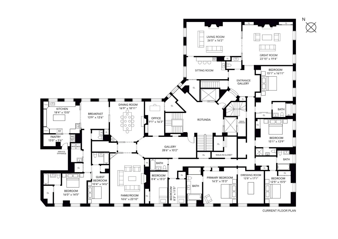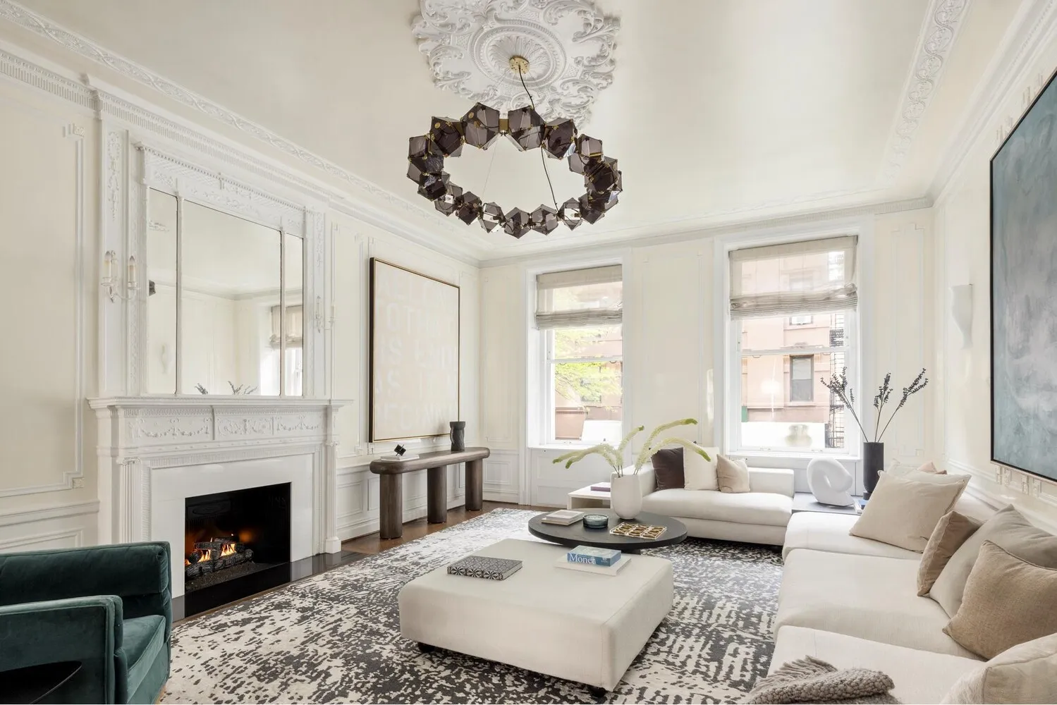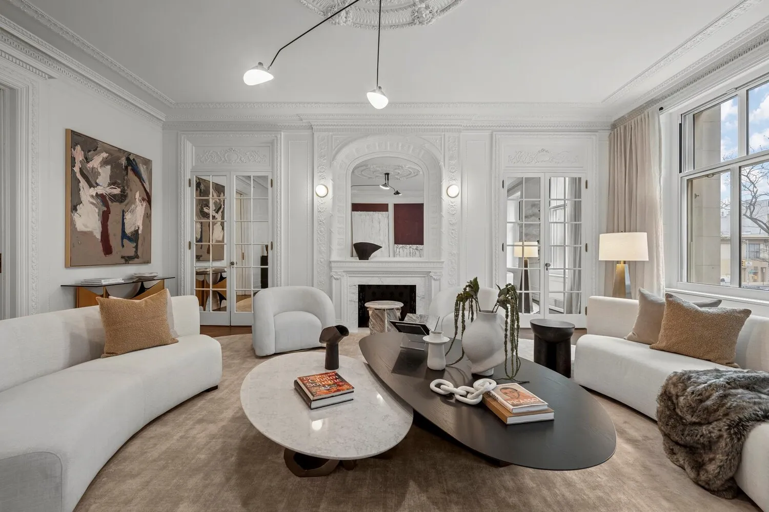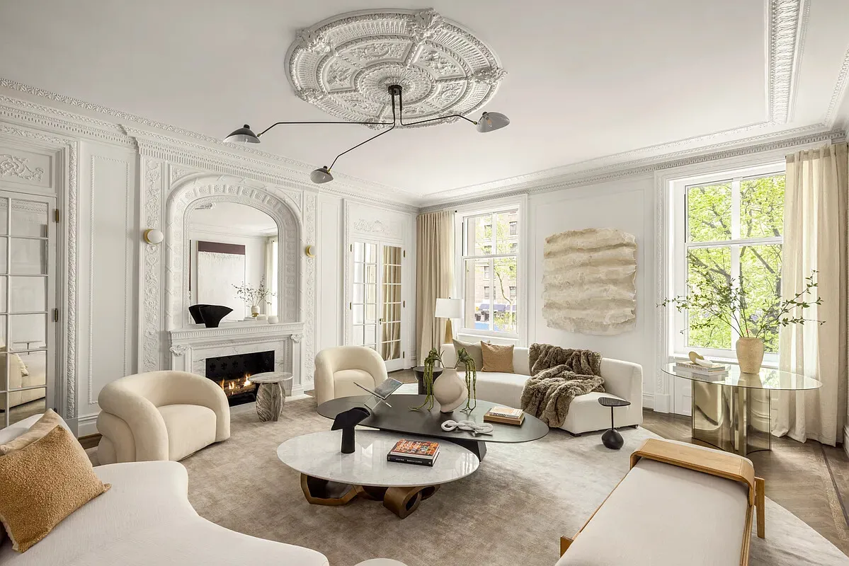 This 9-bedroom, 9-bathroom apartment epitomizes timeless sophistication. Renowned for its pre-war elegance, guests are welcomed by an expansive entry foyer adorned with The Apthorp's original iconic architectural details. Soaring ceilings reaching over 10.5 feet in height create an atmosphere of grandeur. Marble mosaic flooring, stately columns and crown molding demonstrate the expert craftsmanship The Apthorp is famed for. Oak herringbone floors lead you through generously proportioned rooms, featuring elegant fireplaces and majestic original decorative moldings. Oversized windows illuminate the entire space with natural light and offer serene eye-level views onto the flowering trees and fountains of the interior courtyard.