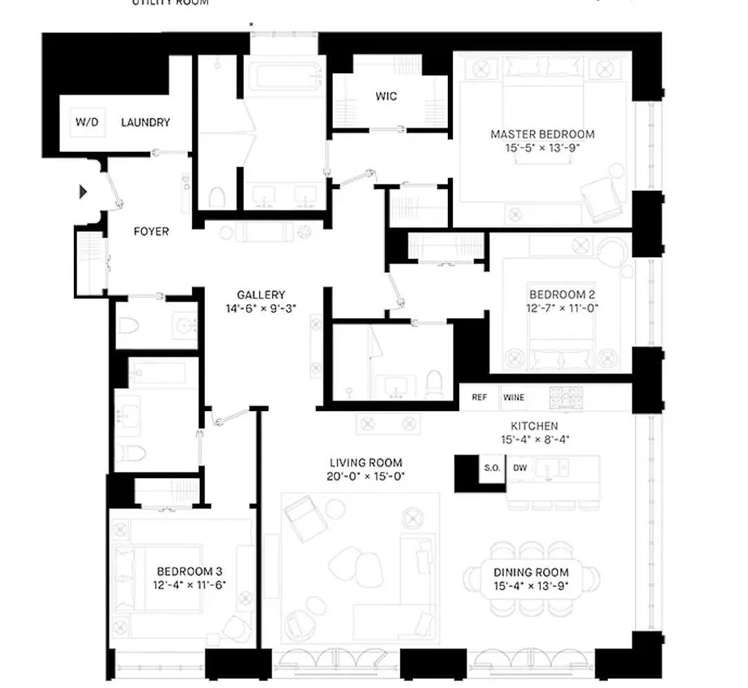 Two additional generous bedrooms, each with an en-suite bath, and a stunning powder room, complete the space.