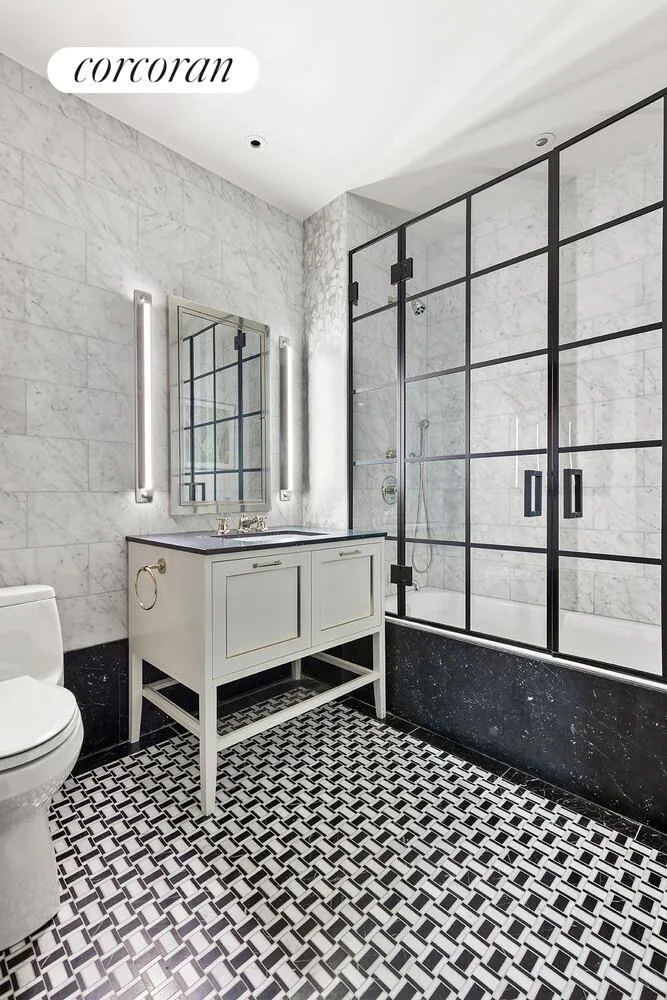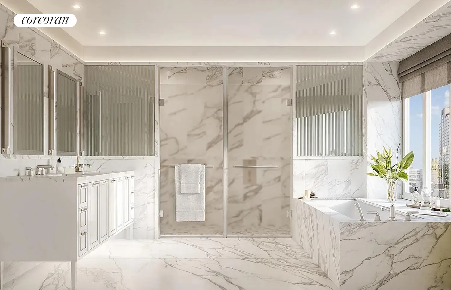 The spacious primary bedroom suite comprises a gracious walk-in closet, secondary closet, and an en-suite primary bathroom adorned with hand-selected Arabescato Cervaiole marble, fluted mirrored glass panels, a custom Italian vanity, and Waterworks Henry collection fixtures in polished nickel. The primary bathroom also features a 6-foot soaking tub, walk-in shower, private water closet, and radiant heated floors.