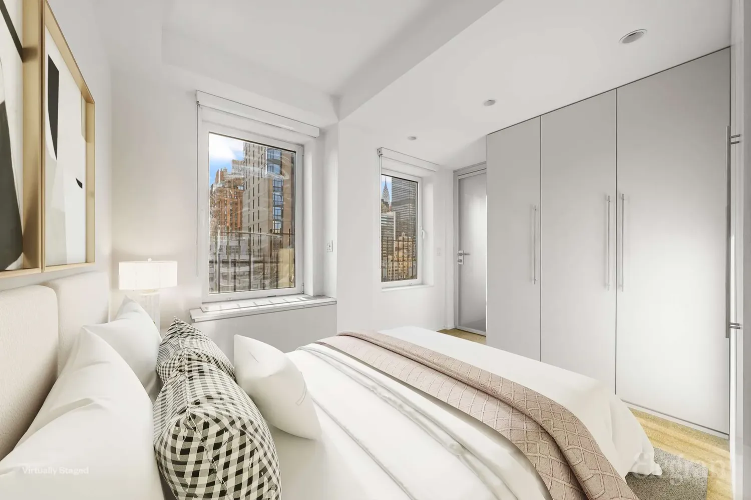 The extraordinary open kitchen is a showstopper, with custom white lacquered cabinets, blue glass walls that mimic windows, cork flooring, and high-end Sub-Zero, and Gaggenau appliances. The bedroom is equally impressive, offering custom lacquered closets, built-in nightstands, and an elegant aluminum and frosted glass door.