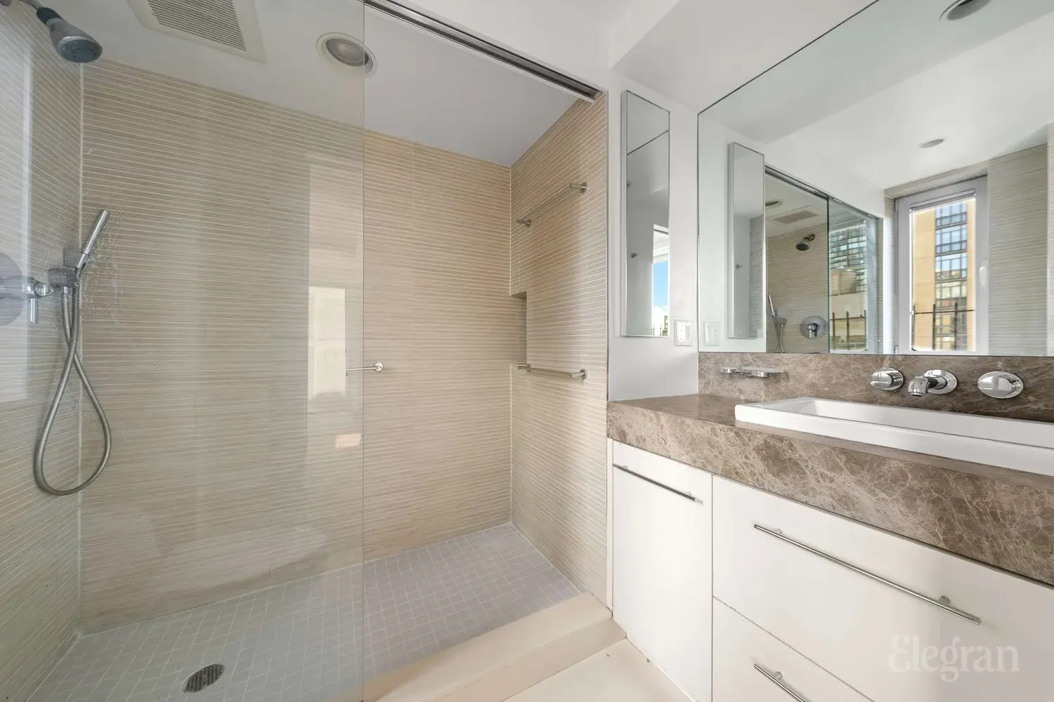 The bathroom is adorned with bamboo-inspired tile, a sleek sliding glass shower, and agglomerate stone counters and flooring. Additional features include new tilt thermopane windows, two built-in McCoy thru-wall air conditioners, and custom TV/media cabinetry.