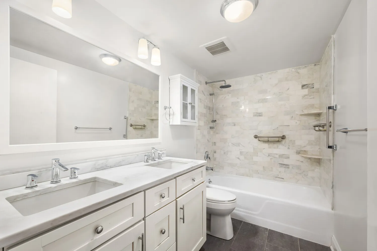 The spacious bedroom features multiple closets and an updated en-suite bathroom with double-sink vanities. A generous walk-in closet in the hallway adds exceptional storage, while a conveniently located powder room offers added comfort for guests.