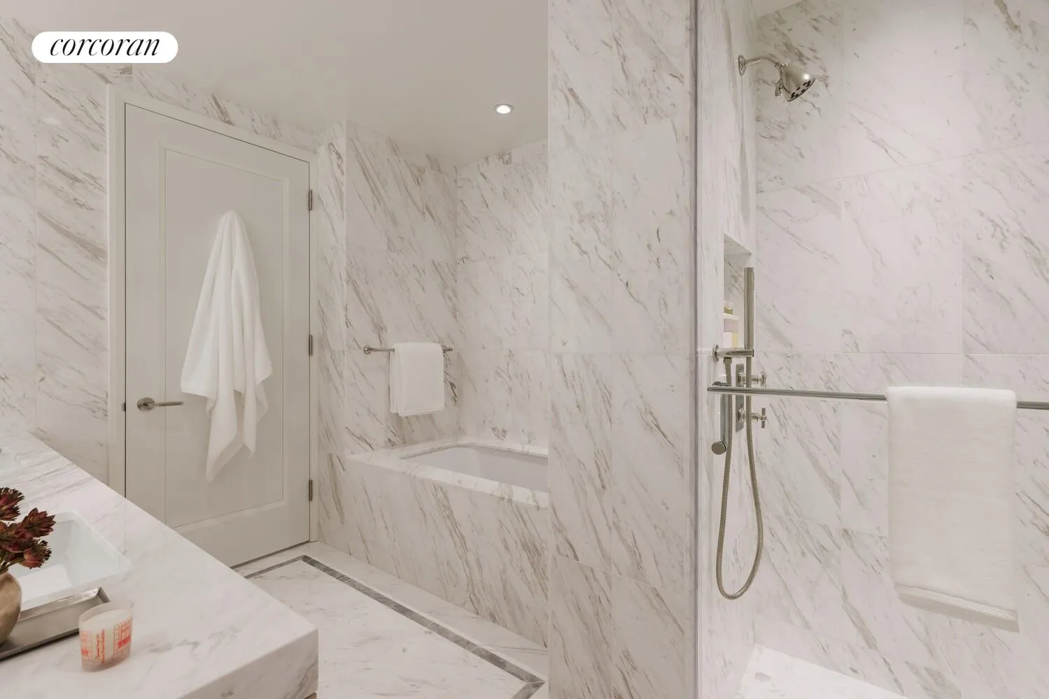 5-fixture bathroom features custom vanities with Volaka marble countertops and undermount