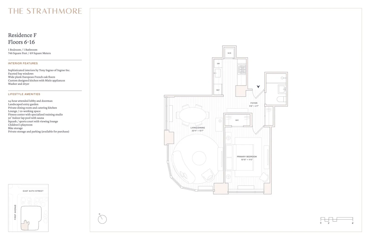 Residence 7F is a graciously designed 746 SF corner one-bedroom, one-bath home with southwest exposure overlooking the NYC skyline, featuring 7-inch-wide European French oak floors and elegant bay windows that flood the space with natural light. The foyer includes an entry closet and leads to a large, closed kitchen outfitted with Miele appliances. Custom Italian cabinetry with Imperial Danby marble countertops accented by polished nickel fixtures, and stainless-steel sink with garbage disposal, complete the space. The bedroom suite is equipped with large walk-in closet, and the bathroom is finished with a custom vanity, Turkish Bianco Dolomite marble countertop, and undermount sink, complemented by polished nickel fixtures for a refined and timeless aesthetic. Residence 7F comes equipped with smart thermostats and vented washer and dryer.