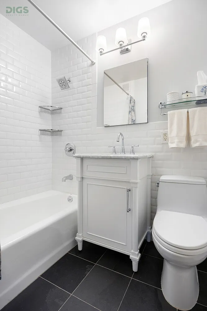 The newly renovated bathroom is beautifully finished with beveled subway tiles and a tasteful marble-topped vanity. The peek-a-boo kitchen features white cabinetry, granite countertops, and stainless steel appliances. The apartment's oversized windows fill the home with light throughout the day. Additional features include solid core doors, through-the-wall A/C, crown molding, and custom built-ins in the living room.
