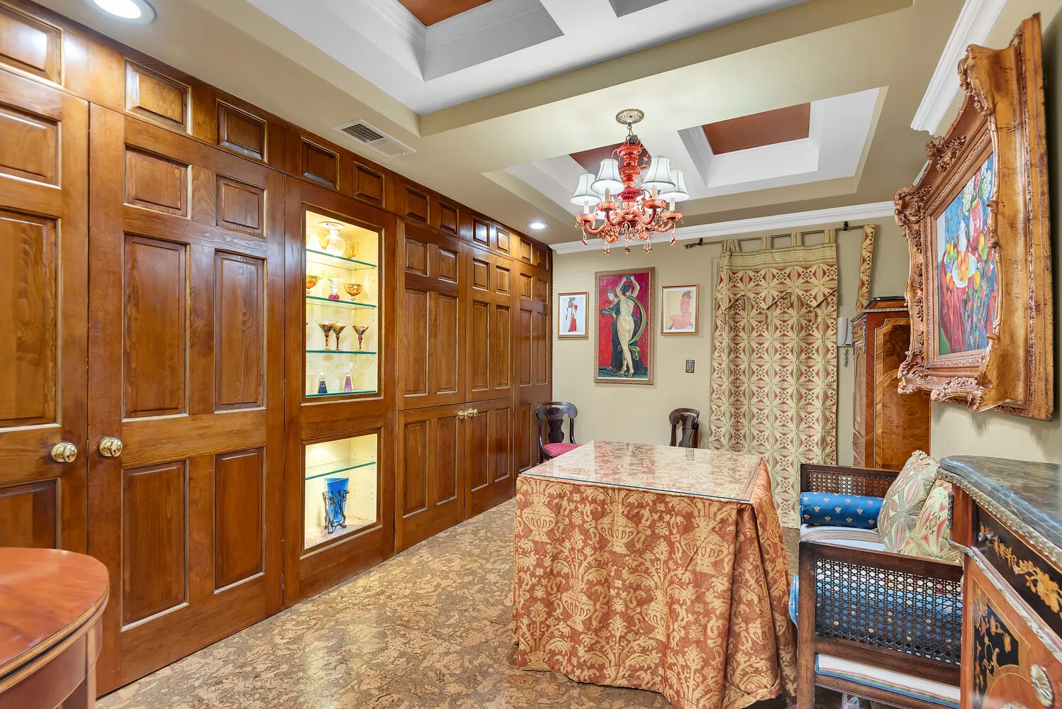 Never wait for the elevator again, just enter through the elegant marble lobby right into your fabulous new home! With great scale and flow, this one bedroom, two bath home is ideal for gracious living and entertaining. Prewar features include high beamed ceilings, beautiful herringbone oak floors and a fabulous decorative fireplace. The peaceful bedroom has great storage space (including built-in storage and desk area) and easily accommodates a king sized bed and oversized furniture. The opulent en suite bath features luxury Sherle Wagner fixtures, an oversized spa tub and marble galore. The second bathroom is similarly fitted and includes a corner shower for those pesky overnight guests. The separate kitchen has tons of cabinet space, stainless appliances, stone countertops and a glass block window and mosaic tile floors and backsplash provide a whimsical midcentury modern touch. The large foyer with abundant built-in storage serves as an ideal dining space. Central air, too! On top of that, you will enjoy easy access to the building's common garden down the hall, which is nicely landscaped and furnished with lounges and BBQs for your relaxation.