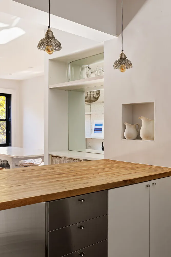 The open kitchen with premium stainless steel appliances, Caesarstone countertops, and a Butcher Block island. A thoughtfully designed split bathroom with a double vanity makes it easy to convert to add a half bath. The primary bedroom enjoys two exposures, and a generous walk-through dressing area which can easily covert to a small third bedroom. A separate office nook with custom millwork and a skylight adds an unexpected touch of convenience. Additional perks include a vented washer/dryer, abundant closets, pocket doors, and a large private storage room in the basement.