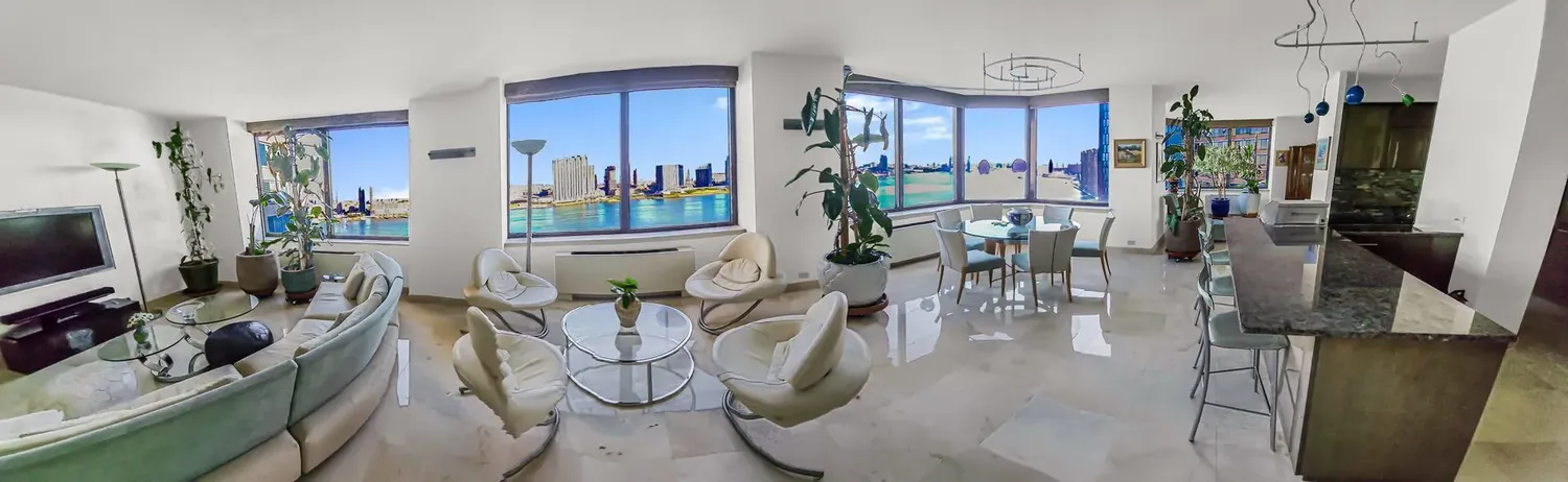 This unique, rarely available combination unit offers spectacular river and city views from the most desirable south, east, and west exposures, through large windows with custom treatments by the Shade Store. The original 8 rooms have been modernized to a spacious 4, comprising a huge 35' open-concept living/dining room, a chef's kitchen, den/bedroom, and an extremely large primary bedroom, plus 3.5 bathrooms. And custom TECH lighting.
