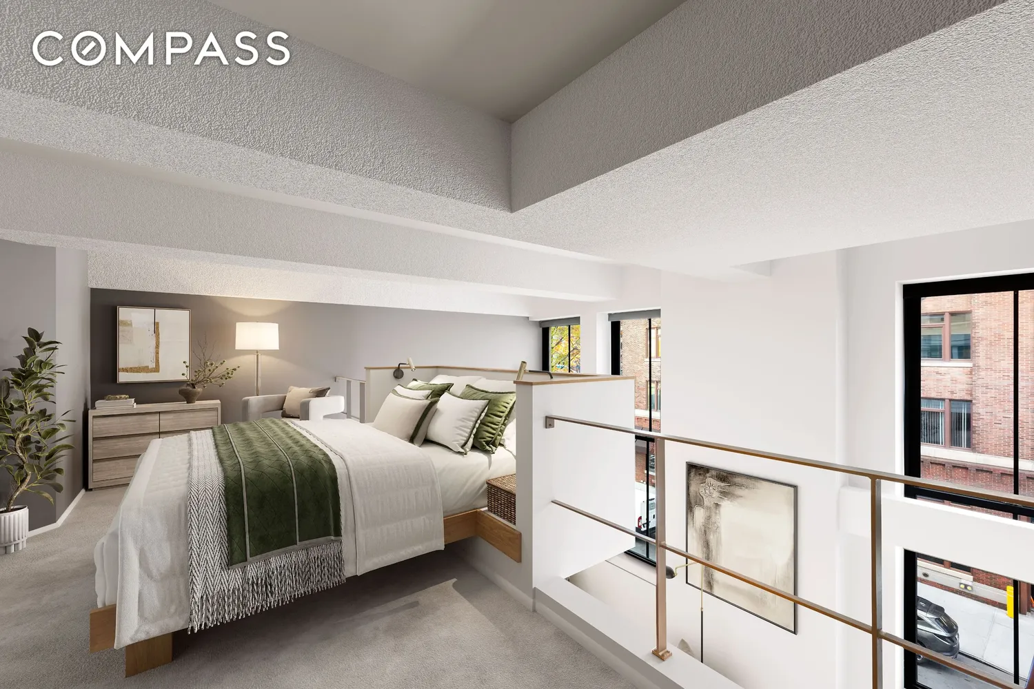 Located on the second floor of this stunning loft apartment, the spacious bedroom features a walk-in closet for ample storage.