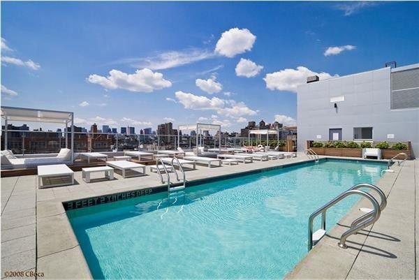 Find beautiful hardwood floors throughout this modern apartment, floor to ceiling windows, and a customized Murphy Bed. The top-of-the-line kitchen features Allmilmo glass and lacquer cabinetry, Celador oyster stone countertops, stainless steel Bosch stove, oven, dishwasher, a Kitchen-Aid microwave, as well as a Liebherr refrigerator. The A Building is a full service luxury condominium built in 2008. Building amenities include: 24-hour doorman service, a fitness center, a 5,000 sq ft rooftop terrace that boasts a 50 foot swimming pool, private cabanas, a grass lawn, a wet bar and BBQ areas.
