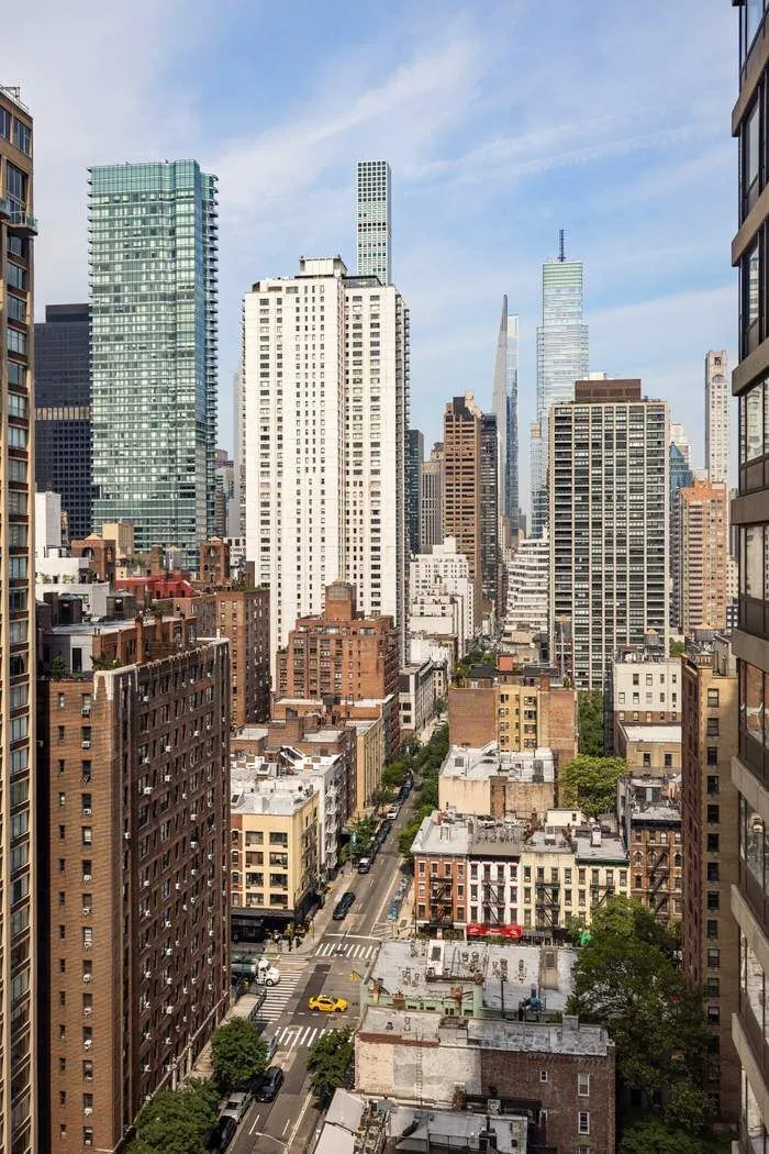 Additional highlights include wide-plank light wood floors throughout, central air conditioning with individual thermostats, generous custom closets, and abundant natural light with sweeping city views to the south, north, and west.
