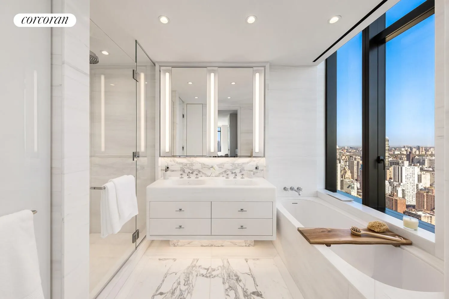 61A is a three-bedroom, three-and-a-half-bathroom residence featuring 2,301 square feet of interior space. The dramatic entry gallery leads to a gracious living and dining area that offers southeastern exposure and oversized windows. A south-facing eat-in kitchen offers Statuarietto marble countertops and Italian custom-crafted matte lacquer white cabinetry adorned with Sub-Zero and Wolf appliances.