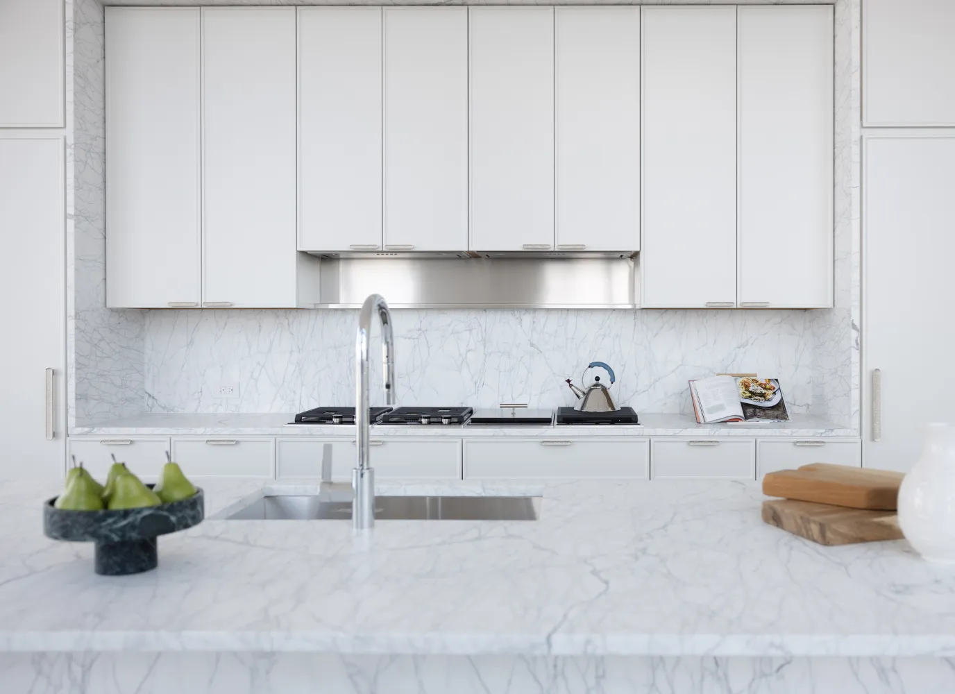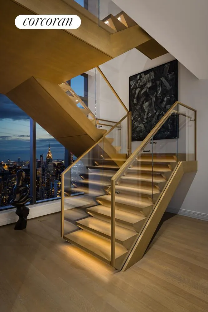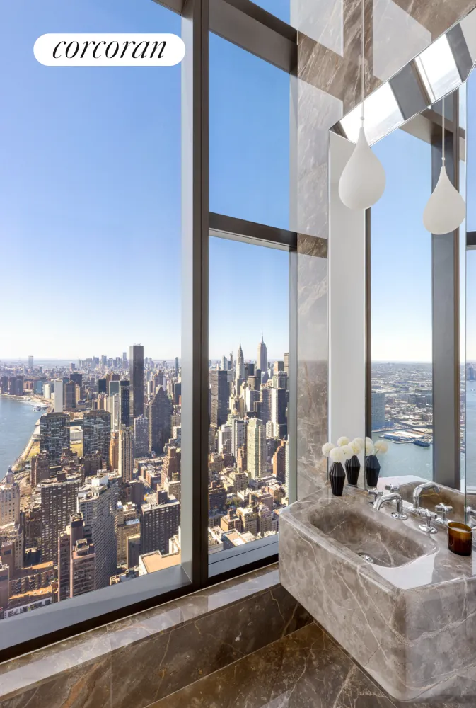 Penthouse 80 is a five-bedroom, six-and-a-half-bathroom residence featuring 9,191 square feet of interior space situated across two full floors, accented by a 166 square foot double-height loggia with southern exposure. Direct elevator entry leads into this expansive home, which offers unmatched views of The Empire State Building, Chrysler Building, New York Harbor, Central Park, George Washington Bridge, and beyond. The dramatic entry gallery leads to a 52'9" x 22'3" great room that boasts 15-foot ceilings and is appointed with a fireplace and wine room highlighted by views to the south, east and north. A northwest-facing kitchen with adjacent great room offers a Statuarietto marble island and Italian custom-crafted matte lacquer white cabinetry adorned with Sub-Zero and Wolf appliances. A formal dining room, butler's pantry, secondary bedroom and elegant powder room highlighted with Fior di Bosco marble complete the first floor.