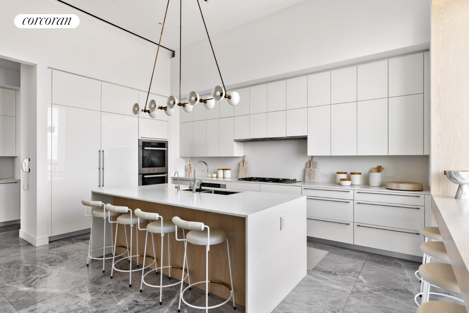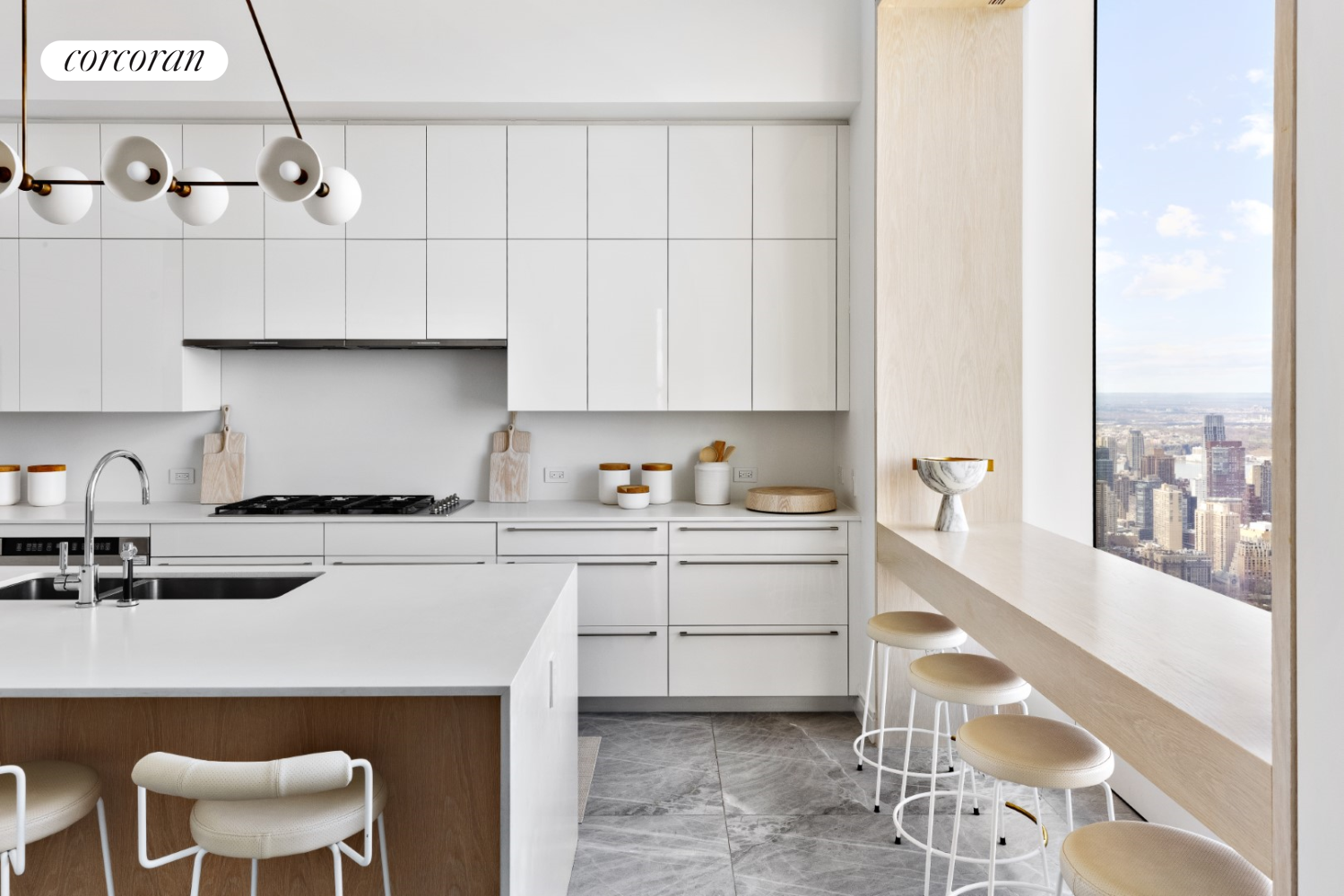 The kitchen overlooks Central Park; finishes include custom white-lacquered millwork, marble floors, countertops, a custom waterfall center island with stool space, and a window coffee bar encased in custom millwork with a full appliance package by Miele. A separate service entrance directly leads to a private service corridor and elevators connecting this residence's northern and southern wings, allowing for maximum privacy.