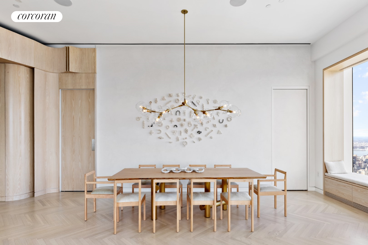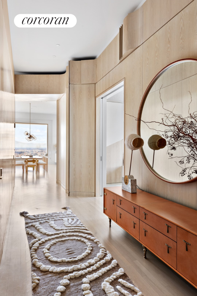 This space leads towards a formal entry gallery opening to the expansive 29" 3" X 29" 3" living/dining room with northern and eastern exposures of Central Park, East River, and the city. Beautiful bleached oak herringbone floors with a strip inlay pattern and floor-to-ceiling custom-fluted built-ins give a sense of serenity and zen while providing movement and flow through the space. These built-ins provide ample storage space and a full entertainment cent, completely out of sight when unused.
