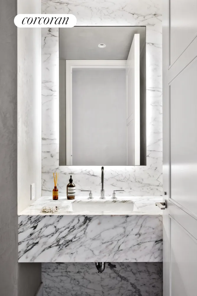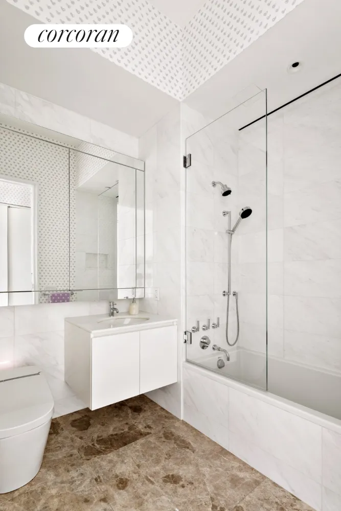 The primary bedroom suite faces south and east with an en-suite bath, a separate dressing room, and a spectacular sleeping area with southeastern corner exposures of the skyline. The primary bedroom sleeping area has beautiful hand-finished walls and custom lighting, bringing a sense of serenity. The en-suite bath features radiant heated marble floors, double vanity, a deep soaking tub, and a marble shower with a separate water closet.