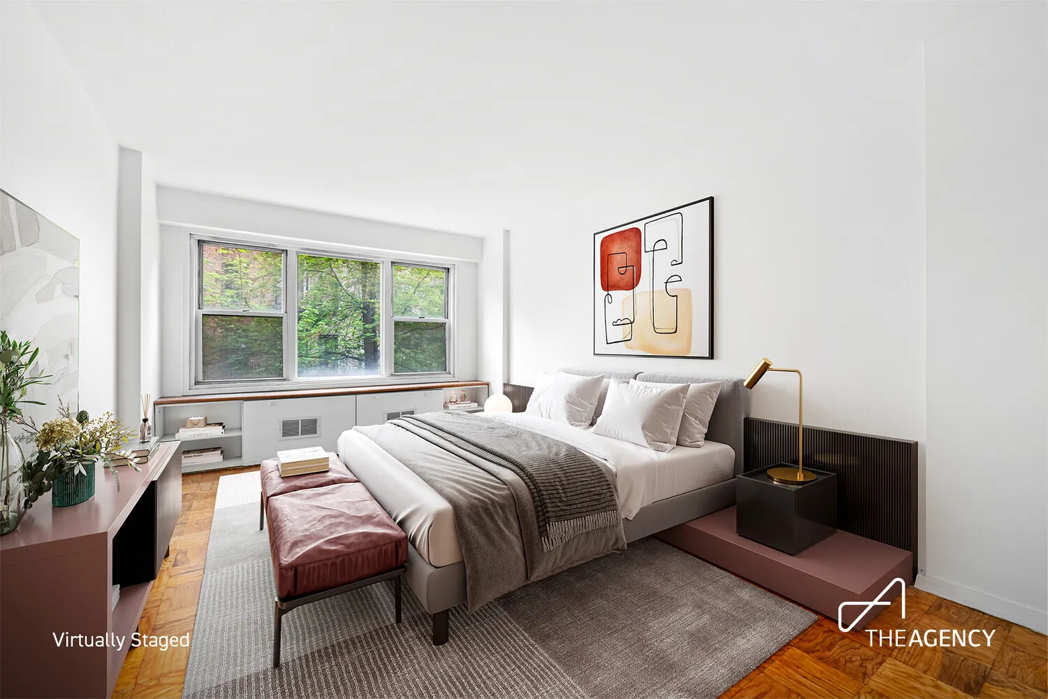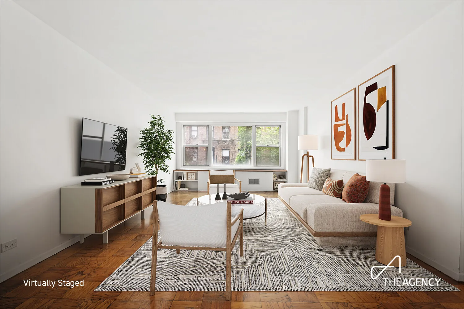 The large living room and dining area can easily fit sizable pieces of furniture. The bedroom, off a separate foyer, can accommodate a king size bed and other furniture. The apartment also features three large closets.