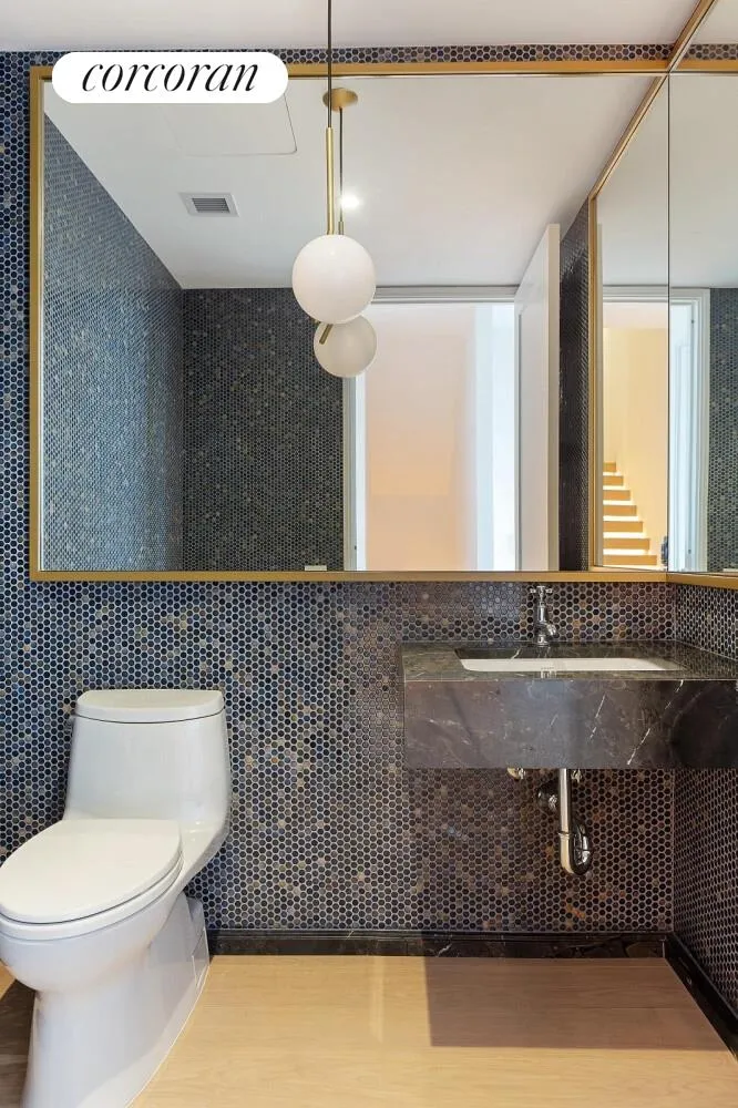 One fight down is the bedroom floor with three bedrooms, two full marble bathrooms, the bonus room, and an in-unit washer/dryer closet . The primary ensuite bathroom includes a deep soaking tub, a separate glass shower, and radiant heated floors. This floor can also be accessed from the public hallway.