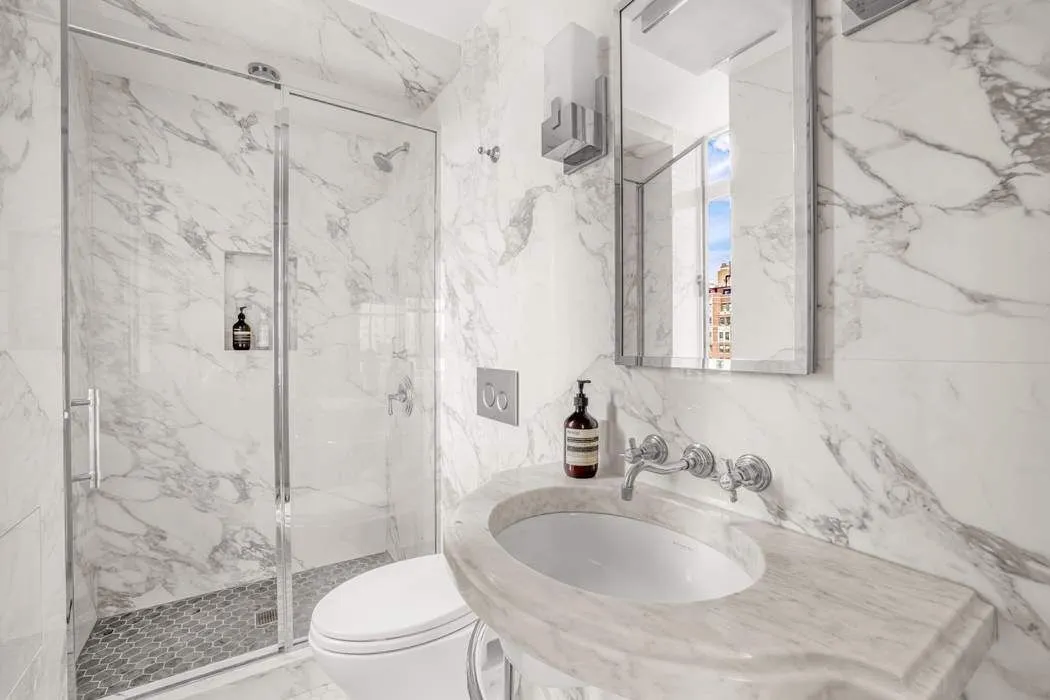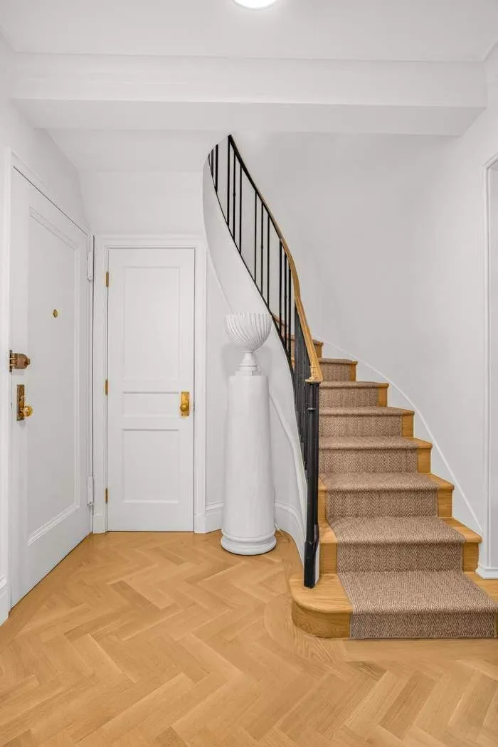 From the kitchen, enjoy Western views to Central Park from oversized new windows. Kitchen features include soapstone counters, two refrigerator/freezers, a Miele dishwasher, garbage disposal, custom white oak cabinetry and island for elegant and efficient entertaining. Adjacent, is a lovely space for semi-formal dining or flexible for other desired uses. Truly multipurpose. A graceful curved staircase leads to the upper level, where two bedrooms with ensuite baths are thoughtfully separated. Each bedroom has abundant direct sunlight and ample custom built-out closet space. The Primary Bedroom enjoys a corner exposure with Park views. The immaculate windowed bathrooms are classic, timeless and elegant with heated flooring and polished nickel hardware. A washer dryer is conveniently located off the hallway. This floor is also accessible via 12th floor elevator landing.