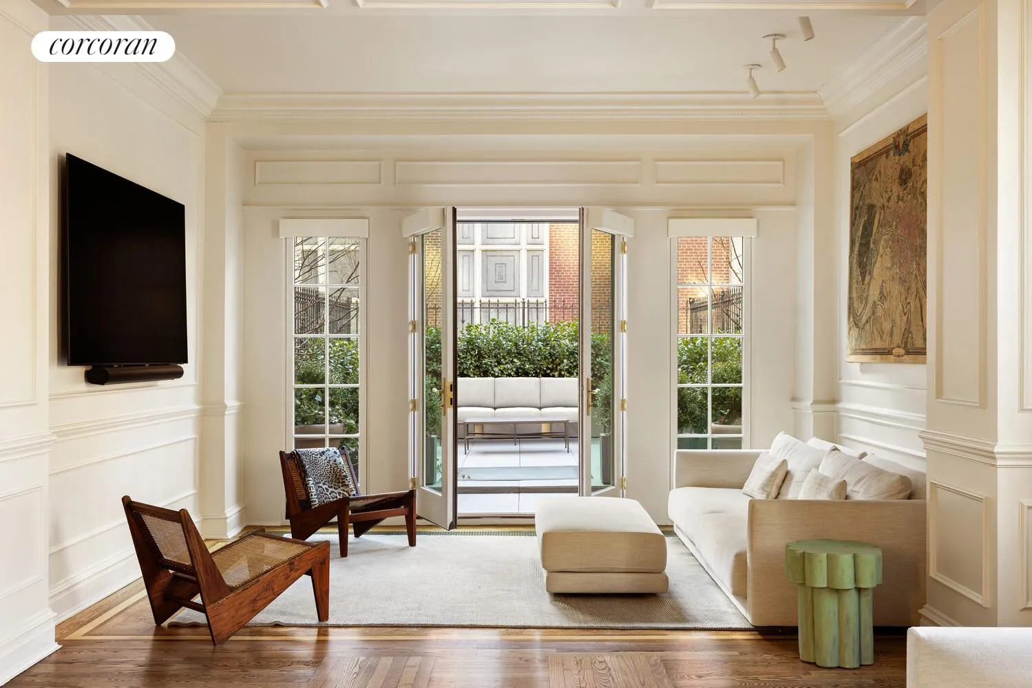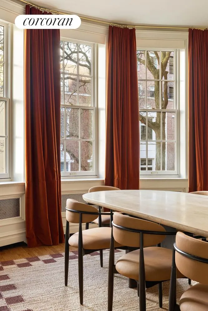 The parlor level is dedicated to formal entertaining and is defined by volume, proportion, and natural light. A sun-filled living room with a wood-burning fireplace is flanked by oversized windows, while a refined sitting room and elegant dining room enjoy direct access to a south-facing terrace, allowing light to travel deep into the interior and creating an effortless indoor-outdoor flow.