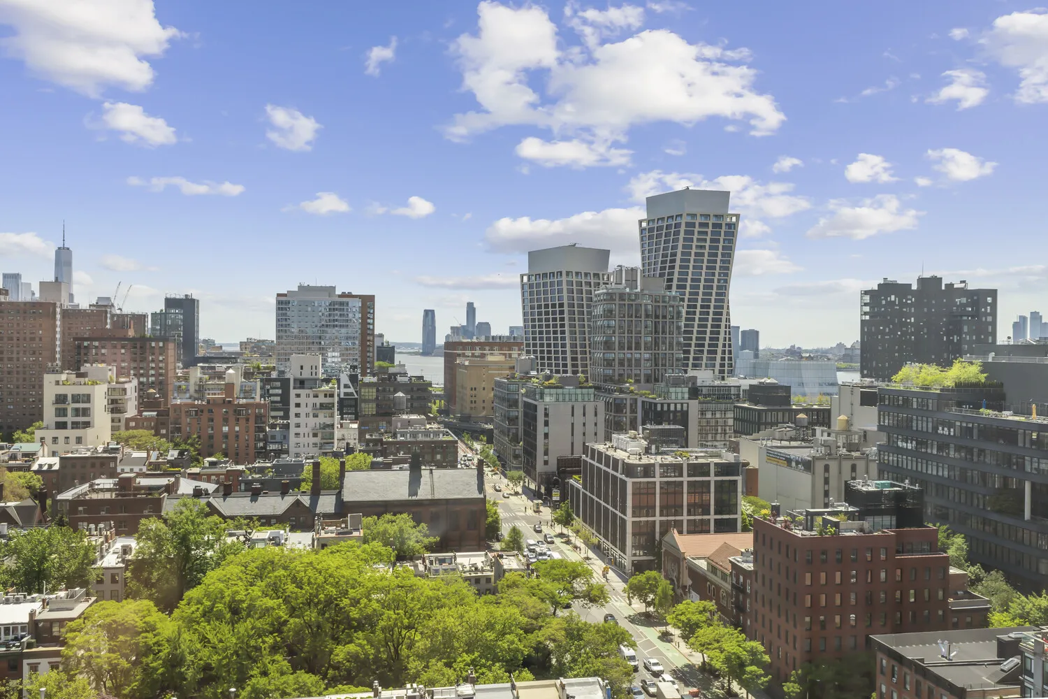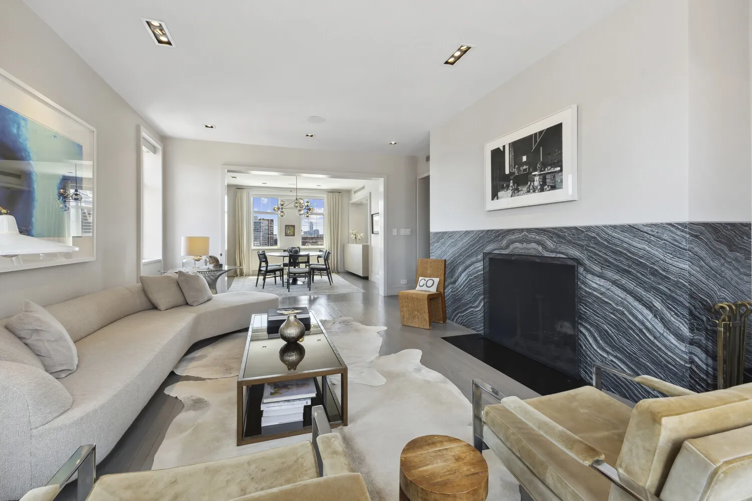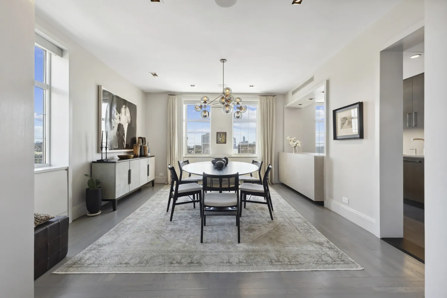 The expansive, 36-foot-wide living and dining area is ideal for both intimate evenings and grand entertaining. Anchored by a marble-clad, wood-burning fireplace, the great room features four oversized windows that frame breathtaking views of the Chelsea Historic District and the city skyline beyond. Adjacent, a separate dining area comfortably seats 8-12 guests beneath recessed lighting, offering the perfect ambiance for curated gatherings.