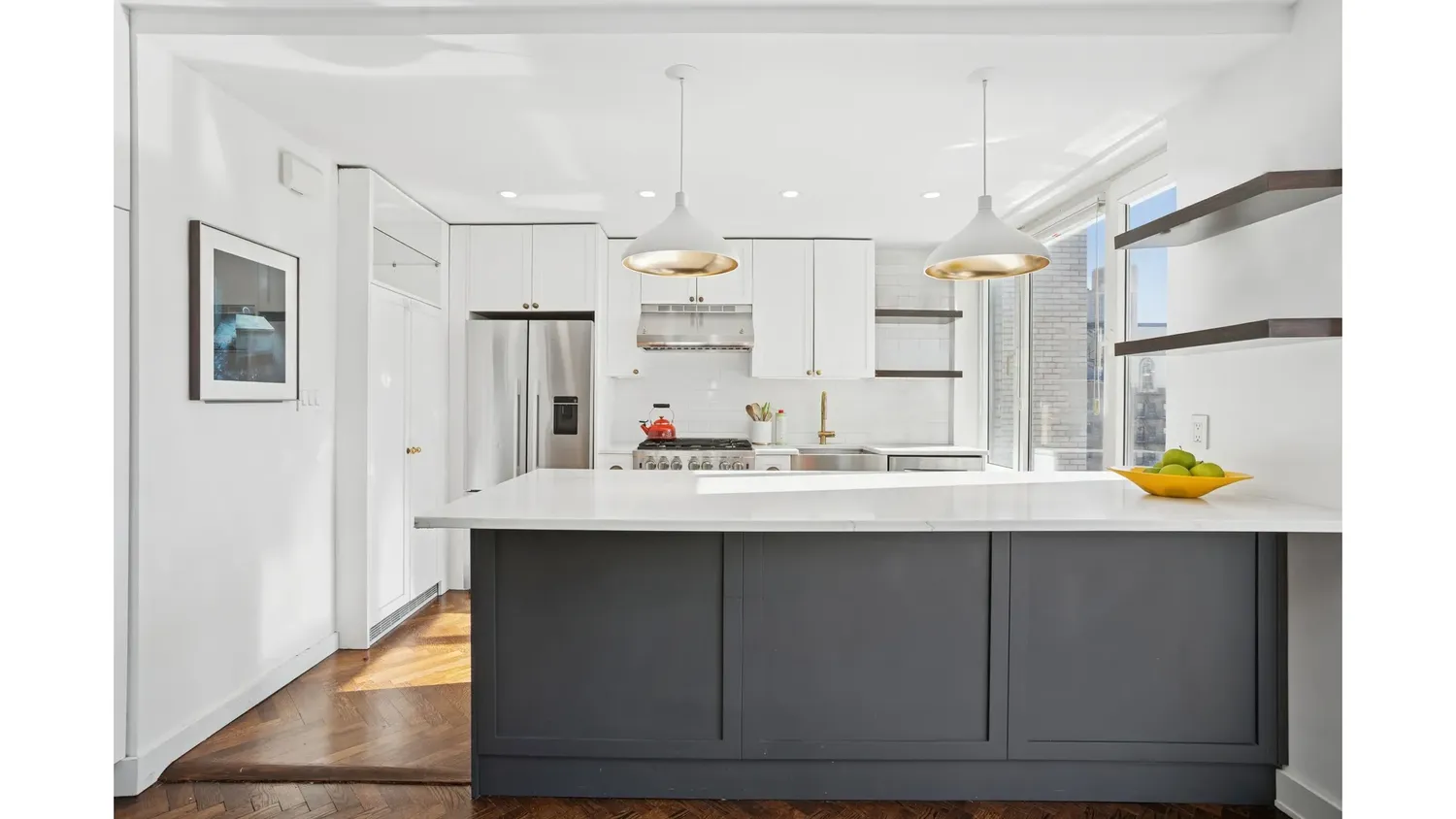 A hallway with a powder room leads to two generously sized bedrooms, each with windowed en-suite bathrooms. The primary suite enjoys north and west exposures, enhancing the light and airiness of the space. Additional highlights include exceptional closet space and hardwood herringbone floors throughout.