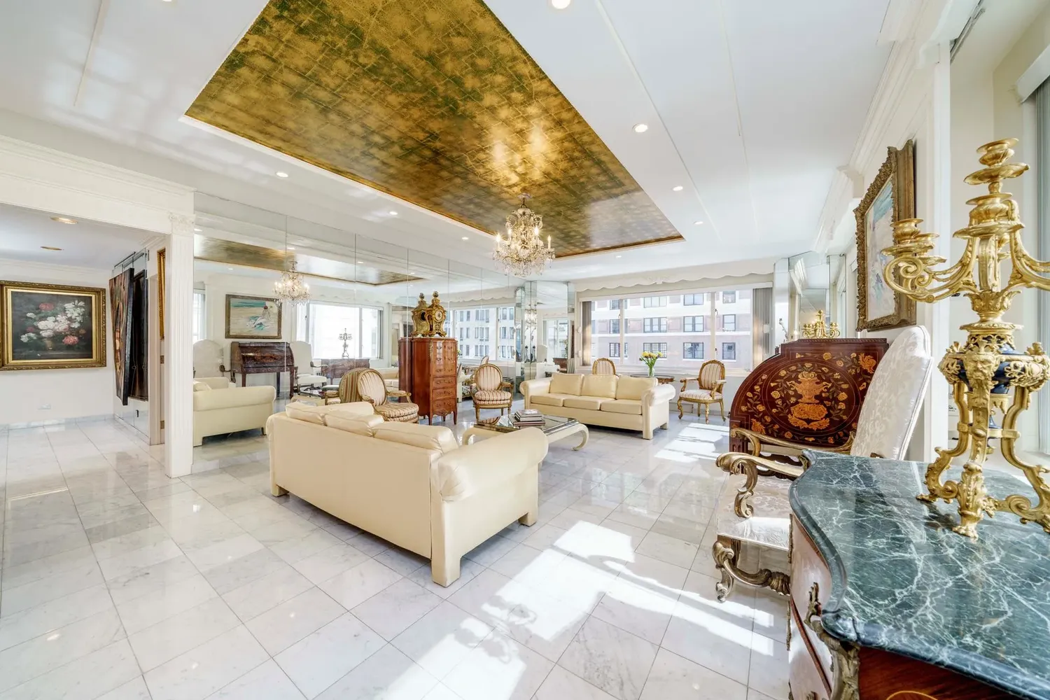 A gracious 19 foot-entry foyer, which separates the entertainment space from the private bedroom wing welcomes you into an apartment of grand scale and proportions. Impressive 10 foot ceilings, crown moldings and recessed lighting are evident throughout. There is a full bathroom for guests and a kitchen off the entry foyer.