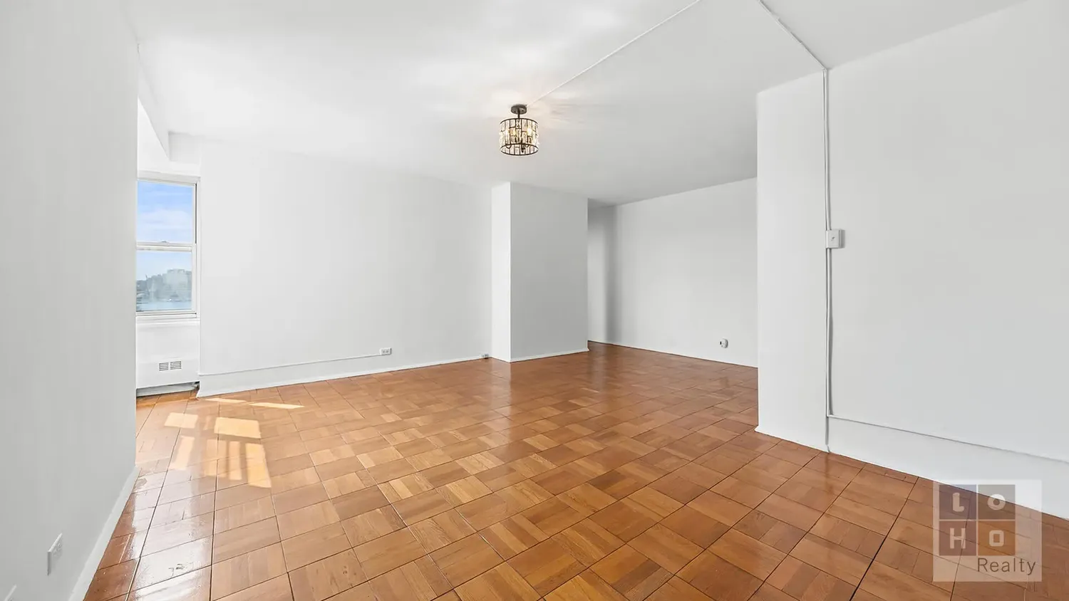 The oversized living room, Complete with separate dining space, offers ample space for both lounging and dining and is bathed in natural light from four corner windows, creating a peaceful retreat in the heart of the Lower East Side.