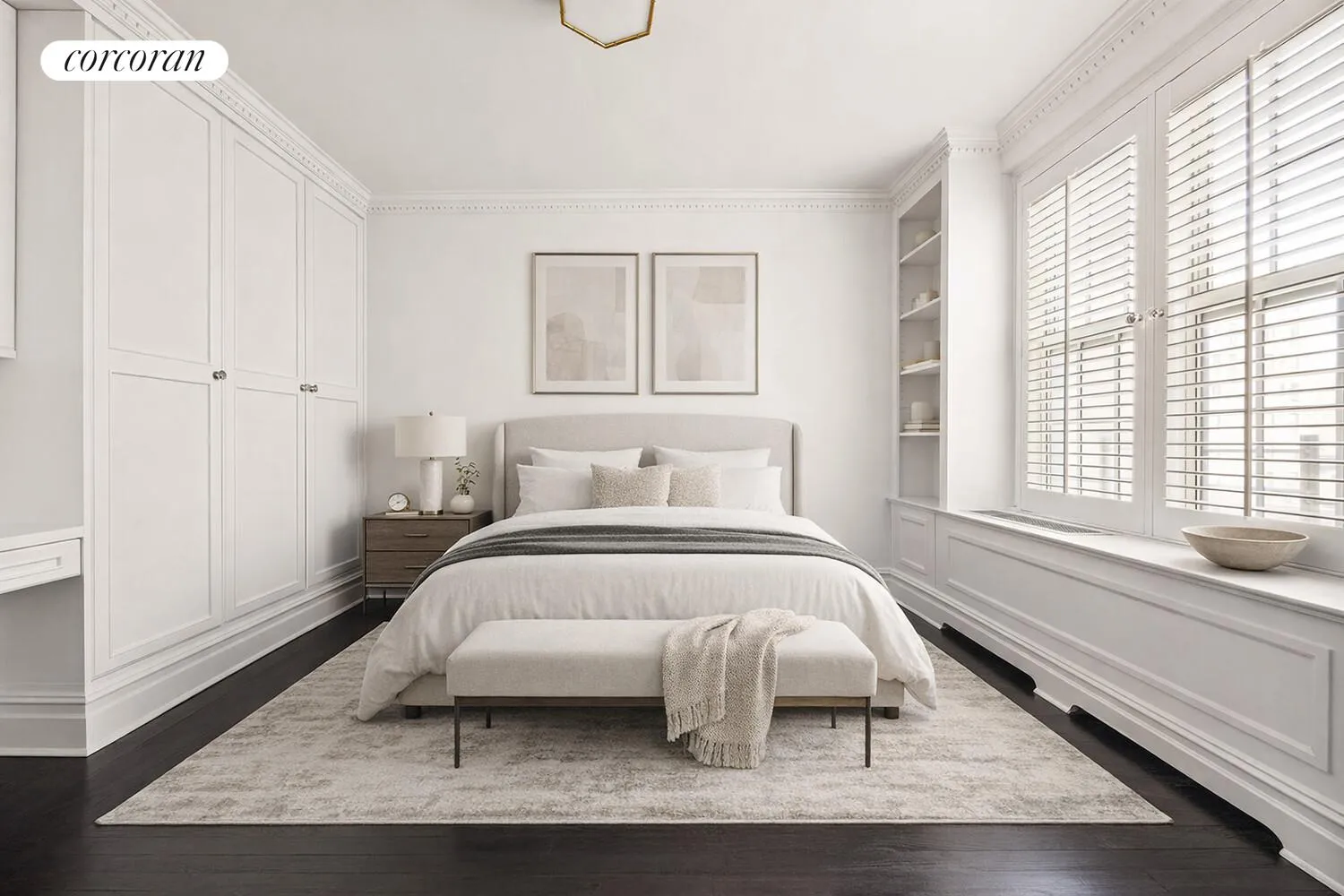 The primary bedroom is a tranquil retreat, distinguished by oversized windows, custom built in closets, and a serene windowed ensuite bath with dual sinks. Natural light and carefully selected finishes lend the space a sense of calm and understated luxury. The secondary bedroom is equally well appointed, featuring its own windowed en suite bathroom and an integrated built in desk, ideal for guests, work from home, or both. Thoughtfully upgraded mechanical systems, including a new HVAC installation, deliver effortless climate control throughout the home. The apartment will be conveyed with deeded storage space.