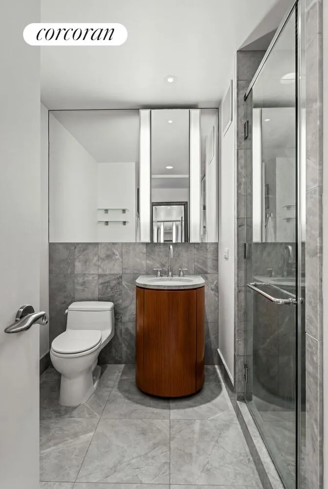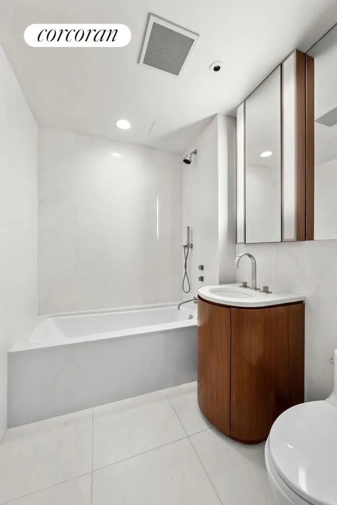 The king-sized primary suite enjoys serene northern exposure and a generous reach-in closet, complemented by a spa-caliber en-suite bathroom featuring a deep soaking tub. The second bedroom, equally well-proportioned, benefits from a bay window with western light and direct access to a full second bathroom with a walk-in shower.