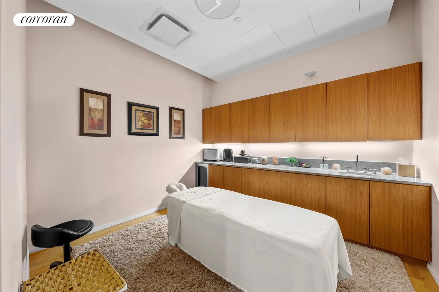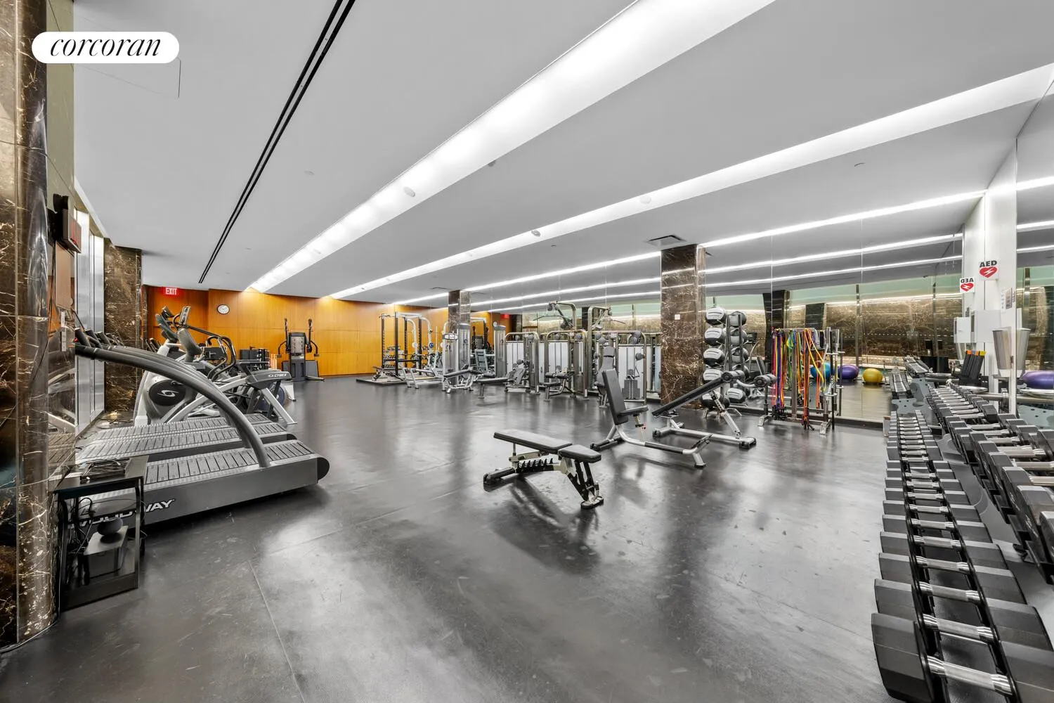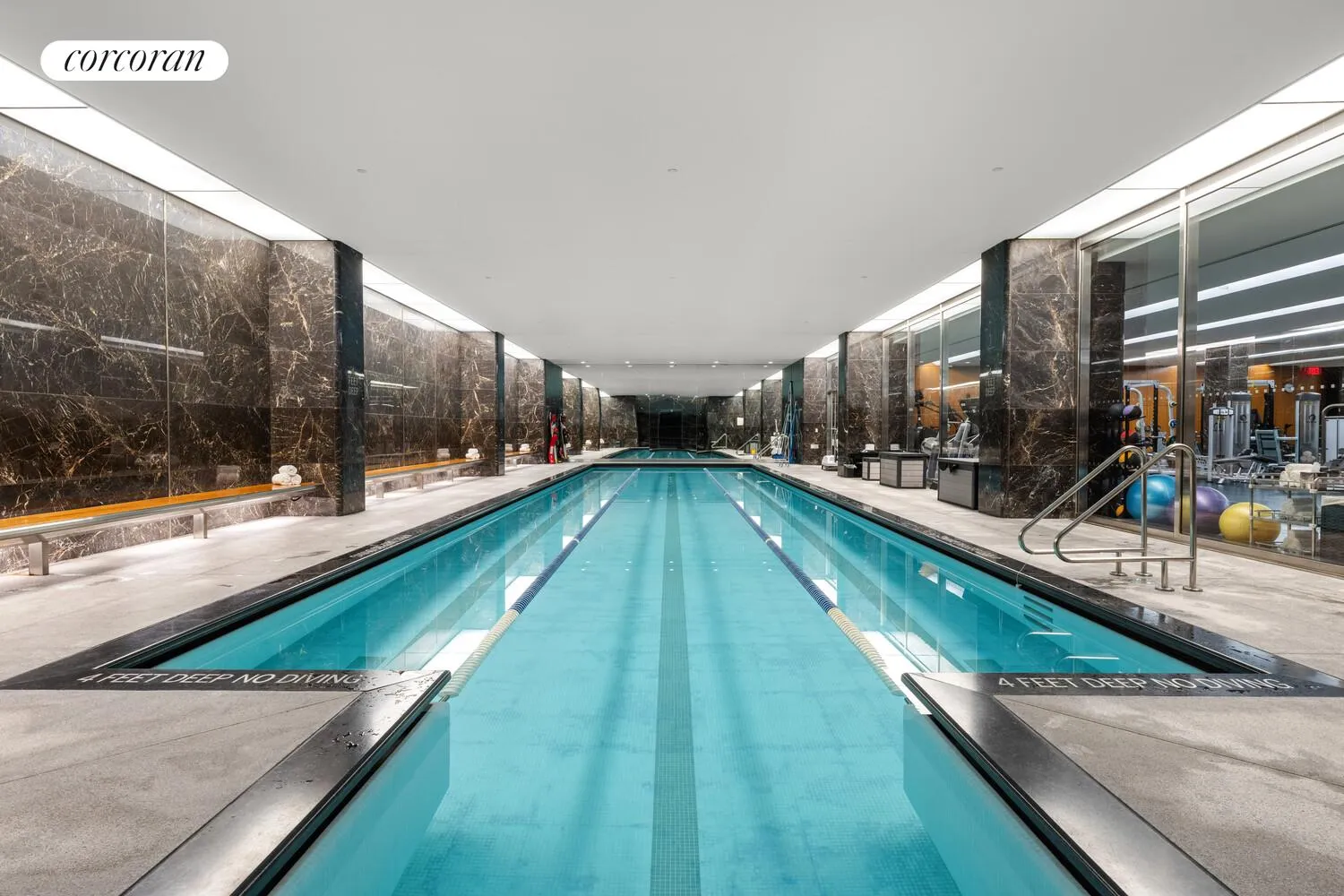 Residents enjoy 24-hour door attendants, concierge, valet, and porter services alongside a resident manager, a children's playroom, cold storage, a bicycle room, and a private conference room. The Wright Fit health and wellness center offers a state-of-the-art gym, a 75-foot swimming pool, and a full spa with sauna, steam, and massage rooms.