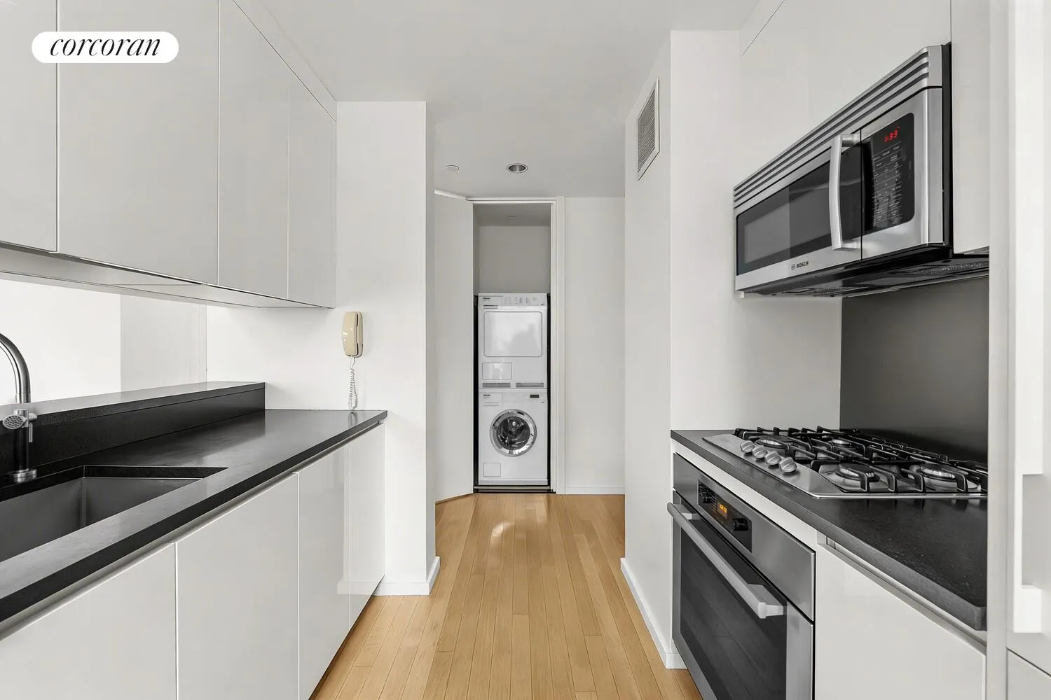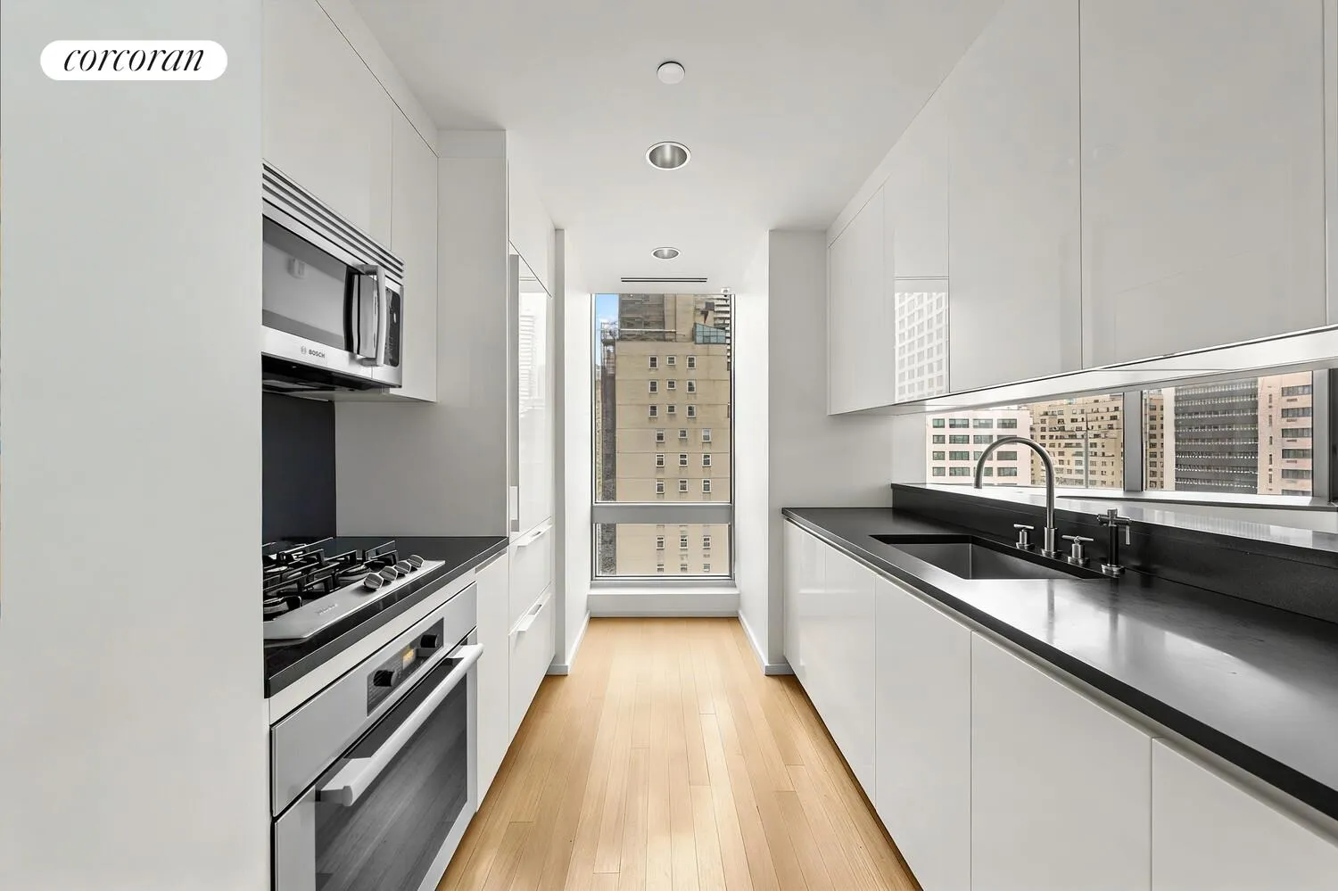 The gallery-style kitchen has been meticulously appointed with honed black granite countertops, custom white lacquer cabinetry, and a floor-to-ceiling window that fills the space with daylight. A convenient pass-through connects to the dining area, while integrated premium appliances from Bosch, Miele, and Sub-Zero ensure a seamless culinary experience.