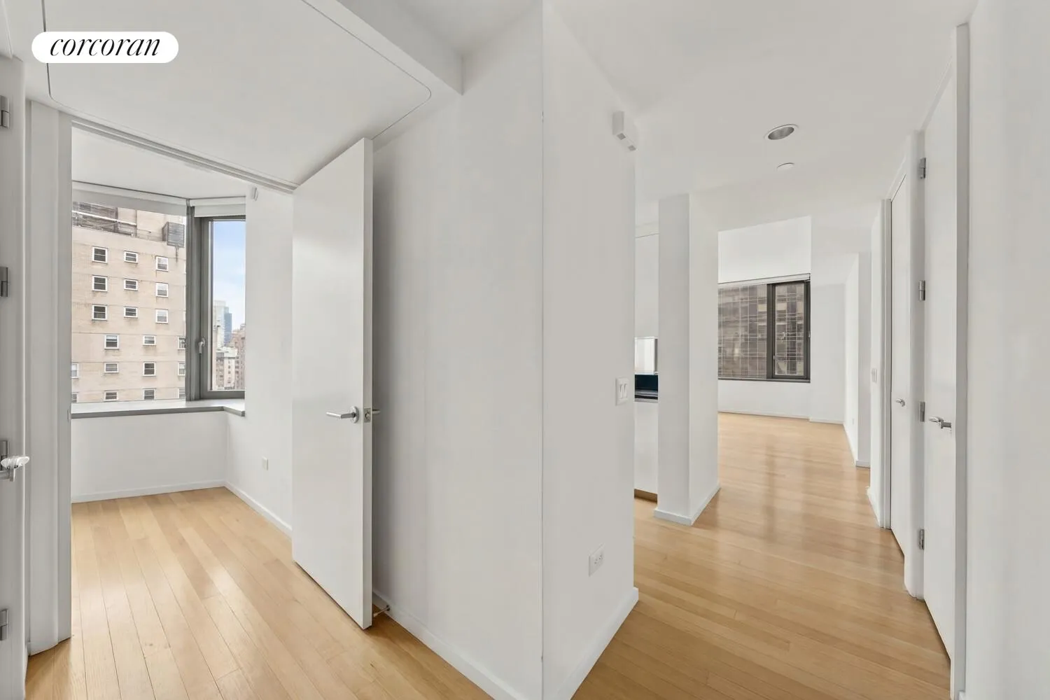 A gracious foyer with a coat closet sets the tone upon entry, opening into a luminous semi-open living room, dining area, and kitchen bathed in northern and western exposure. A dramatic bay window frames cinematic views of the Manhattan skyline, creating a striking focal point for everyday living and effortless entertaining.