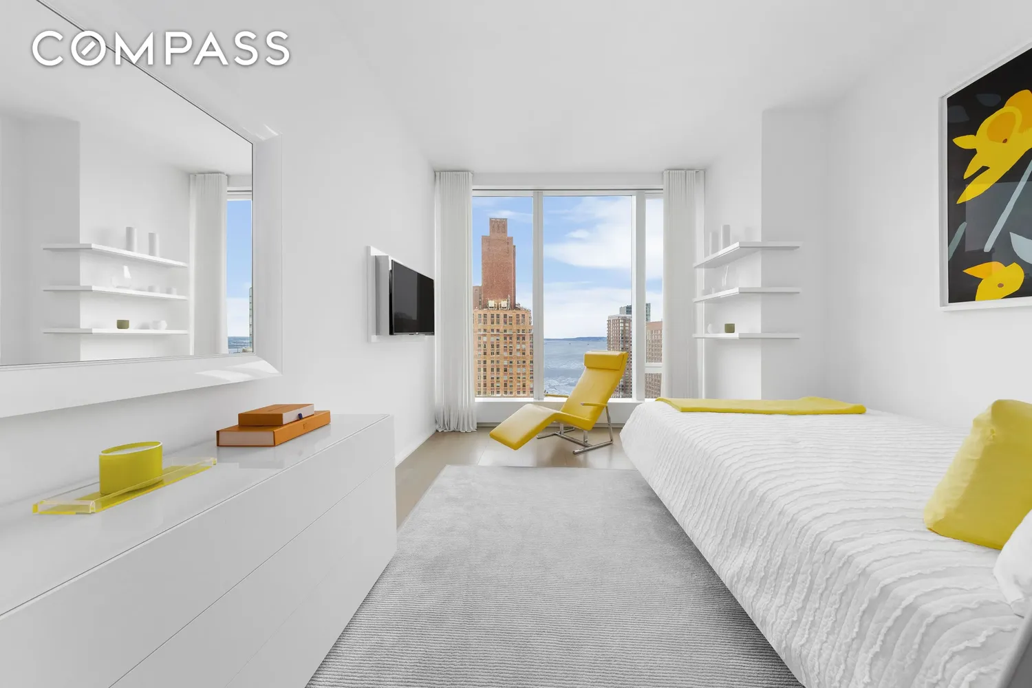 The primary suite is a serene, architecturally composed retreat featuring custom millwork, built-in lacquered headboard detailing, and fully custom-designed closets. Oversized curved glass windows continue the panoramic skyline views, while white oak hardwood floors add warmth and continuity. The second bedroom is generously proportioned with custom-built closets and refined finishes consistent with the home’s bespoke design language. A third flexible room — currently designed with a custom glass wall partition — functions seamlessly as a home office, media lounge, or additional bedroom. Custom built-in mirrors in the primary bedroom and study enhance light, depth, and architectural symmetry while seamlessly integrating into the home’s bespoke millwork design. This thoughtful architectural reconfiguration enhances versatility without compromising design integrity.