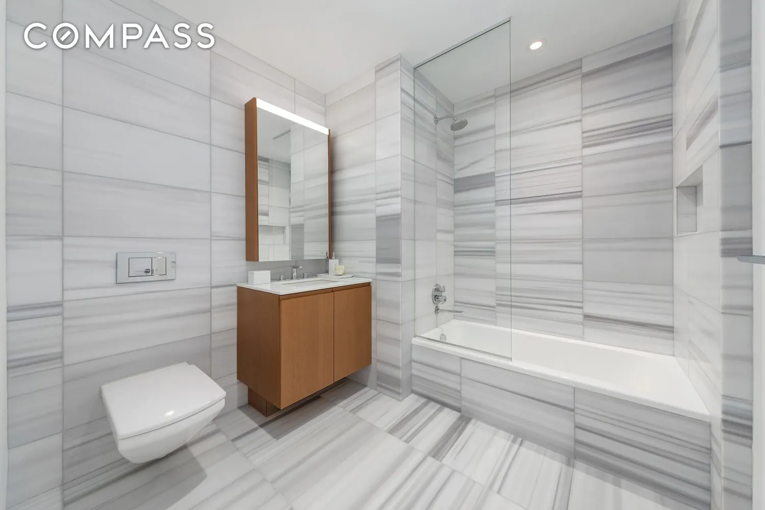 The spa-caliber primary bath offers a five-fixture layout with floating backlit marble vanity, radiant heated floors, Hansgrohe polished chrome fixtures, and a Toto electronic toilet with integrated bidet functionality. In total, the residence offers three full marble baths and a powder room, each featuring custom vanities and elevated material selections.