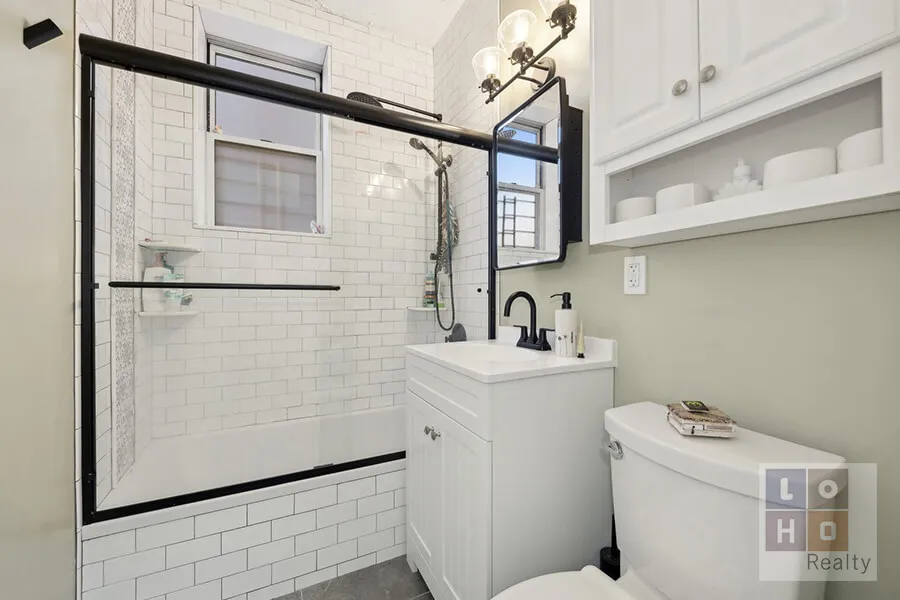 Between the living area and kitchen is a versatile dressing area that can easily double as a home office nook. Just beyond is the beautifully renovated windowed bathroom, finished with white subway tile, a deep soaking tub with glass shower doors, a new vanity, updated lighting, and tiled flooring.