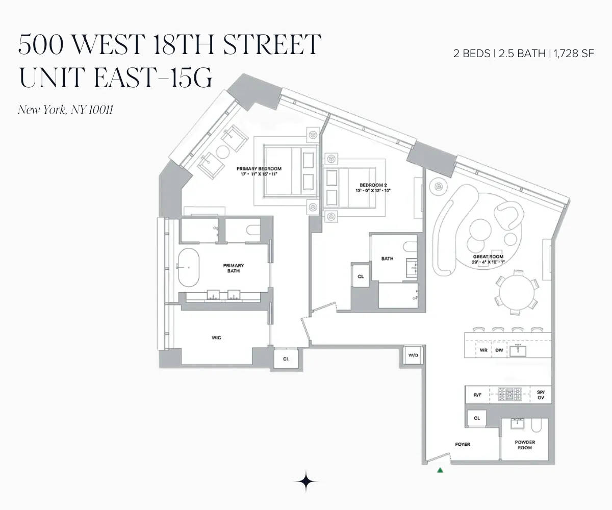 Residence East 15G spans 1,728 square feet across two bedrooms and two-and-a-half baths. Oak chevron floors anchor an expansive great room that transitions seamlessly into the open kitchen. This home is envisioned for entertaining and elevated living.