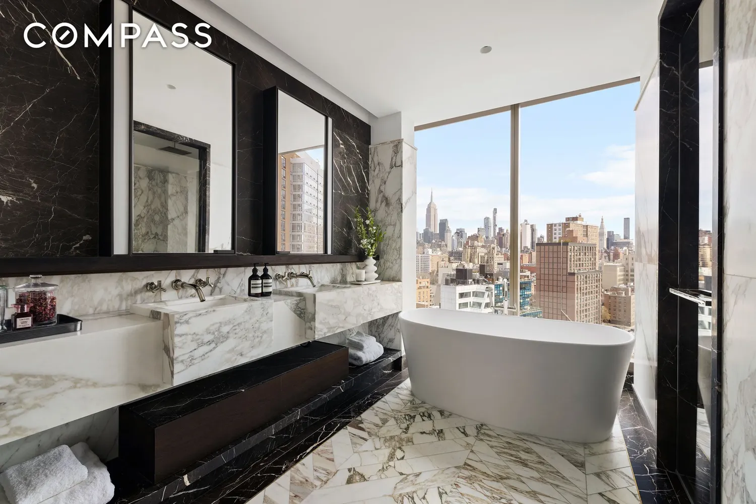The primary suite is defined by its expansive views of the NYC skyline. There is generous storage, including a substantial walk-in closet. The statement bathroom features a luxurious soaking tub with majestic Manhattan views and appointed with Arabescato Vagli Oro and Saint Laurent marble. Radiant heated floors, glass-enclosed shower, and bespoke double vanity create a private wellness experience.