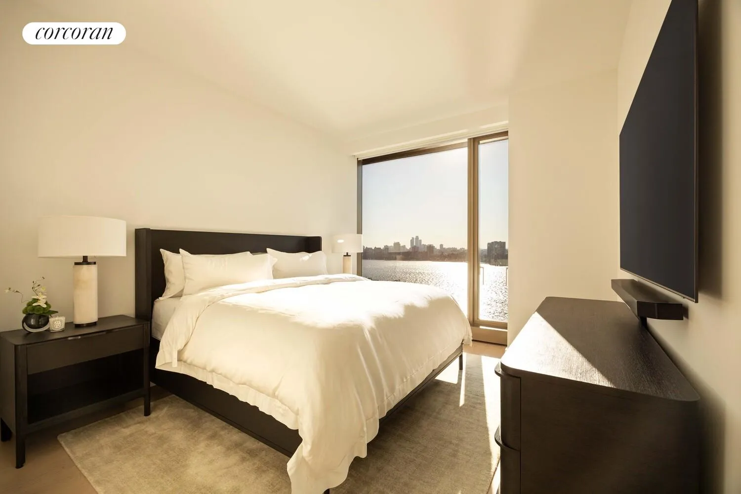 The primary suite offers a serene retreat with floor-to-ceiling windows and abundant natural light throughout the day, while the elegant en-suite bath is clad in Taj Mahal Quartzite and features radiant heated floors, a custom Lumix vanity, an integrated illuminated medicine cabinet, and etched glass doors.